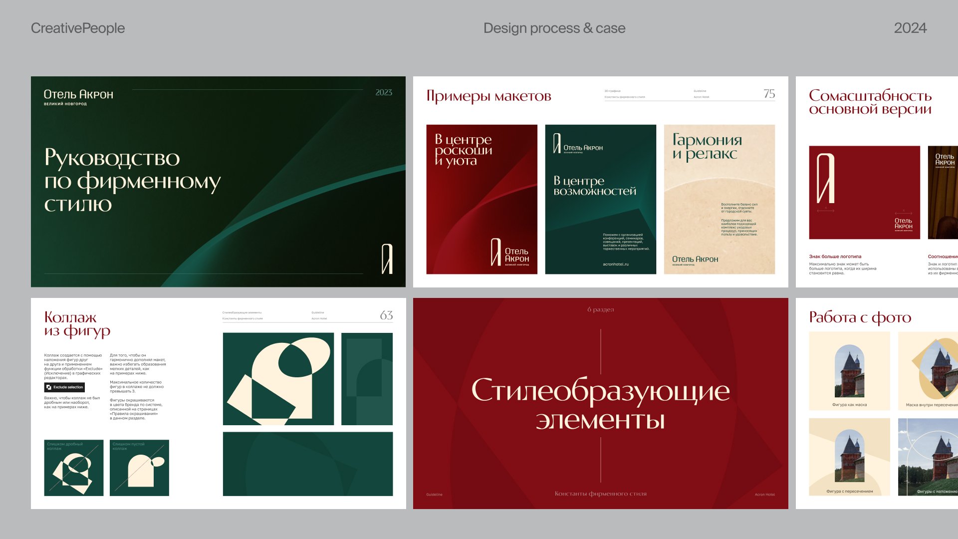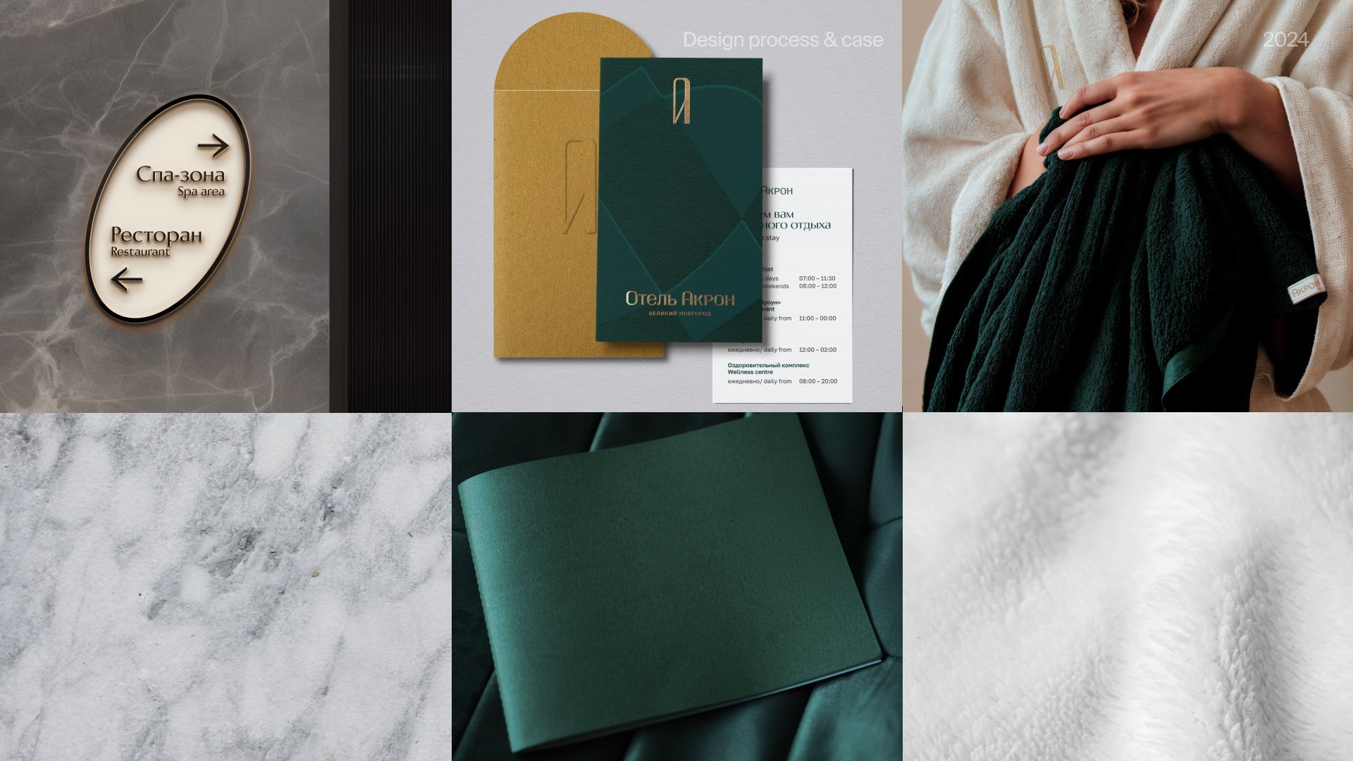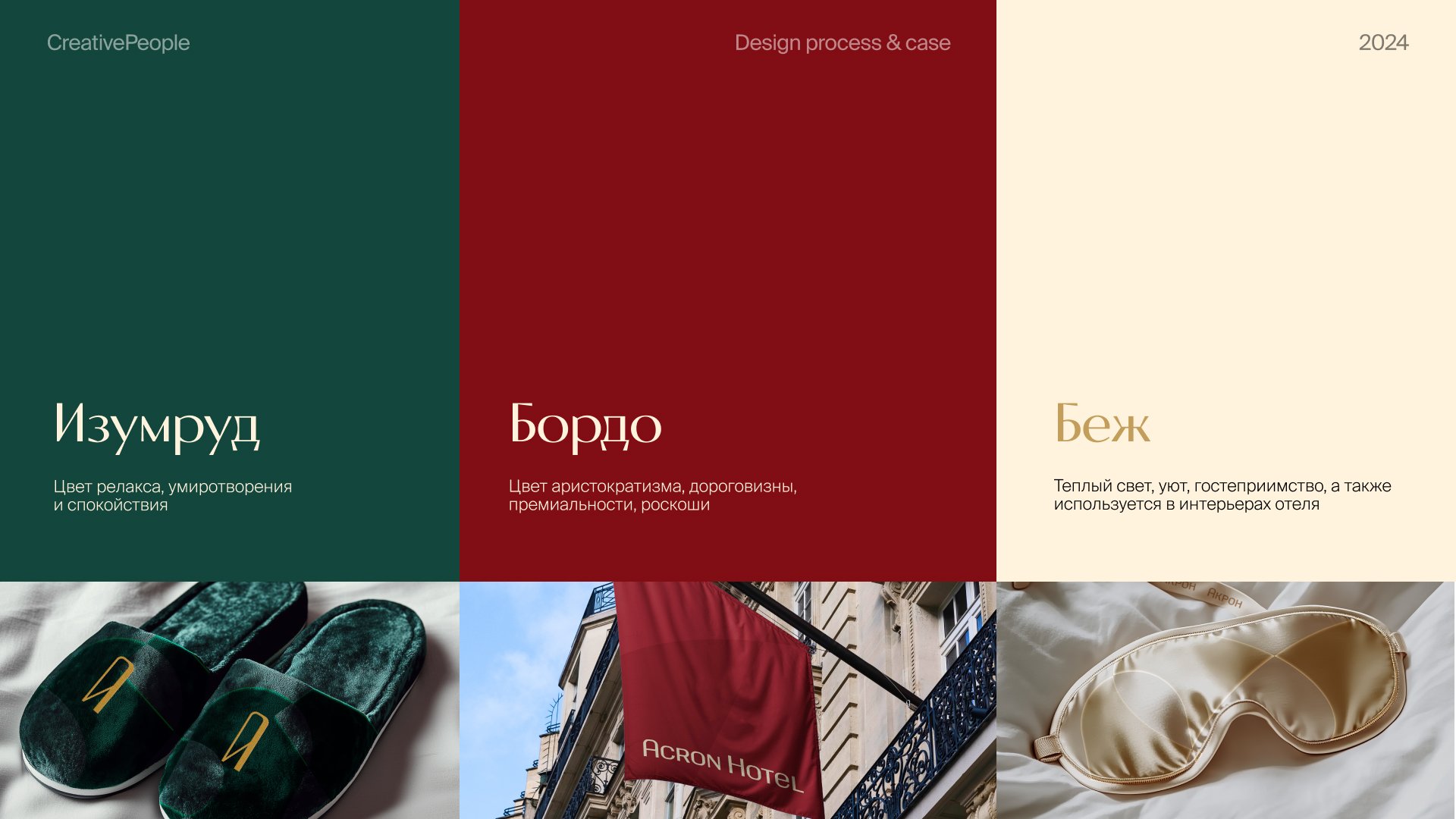 Опирались на корпоративные цвета промышленного холдинга «Акрон», частью которого является одноимённый отель, — зелёный и красный. Но подобрали более глубокие оттенки, которые продолжат премиальный стиль обновлённого отеля: бордо и изумруд. Добавили в основную палитру бежевый, чтобы облегчить дизайн и сохранить привязку к цвету отеля и его экстерьерам, плюс системные чёрный и белый. Также разработали дополнительную палитру из приглушённых оттенков.