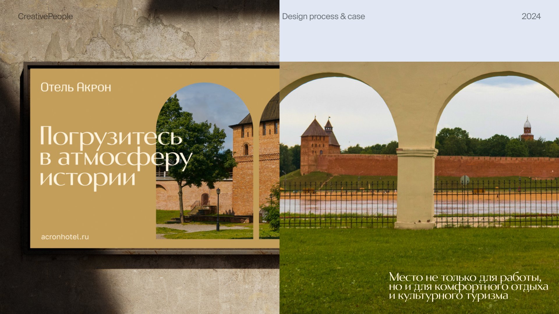 Клиент пришёл с запросом на дизайн, отражающий преимущества отеля и удачное расположение в историческом центре Великого Новгорода. Основная целевая аудитория — бизнес-сегмент, а позиционирование отеля — «это место не только для работы, но и для комфортного отдыха и культурного туризма».