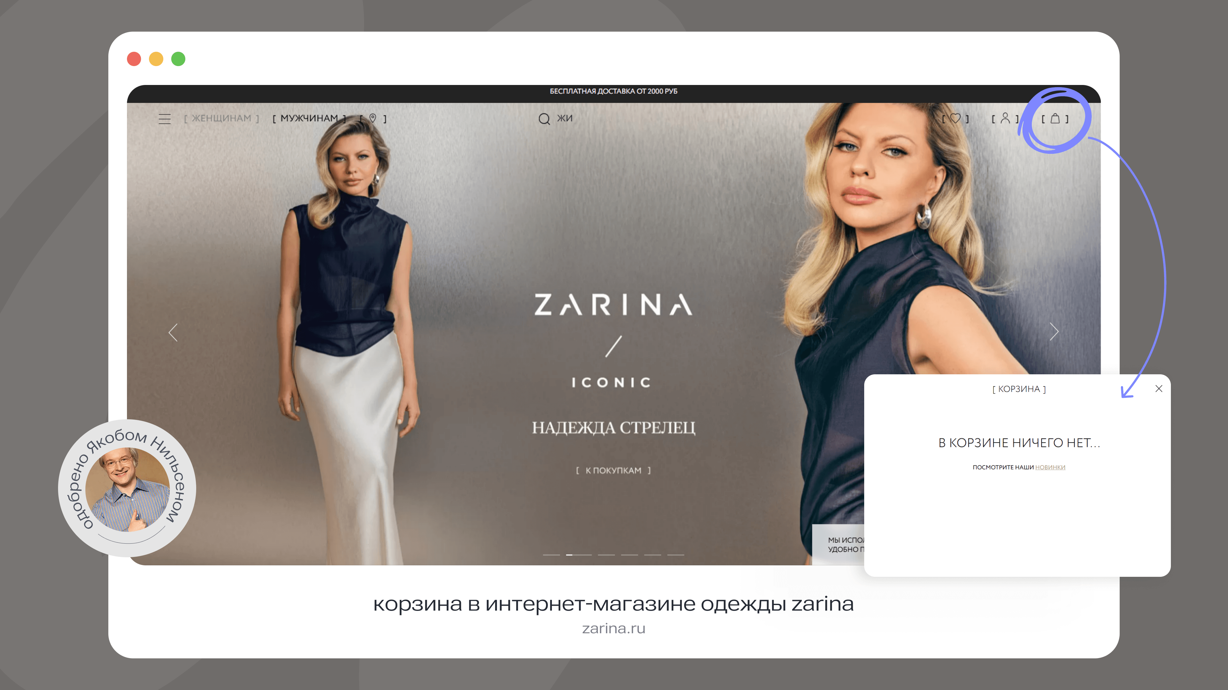 ● Корзина. И иконка в правом верхнем углу; клик открывает мини-панель с товарами и кнопкой «Оформить».