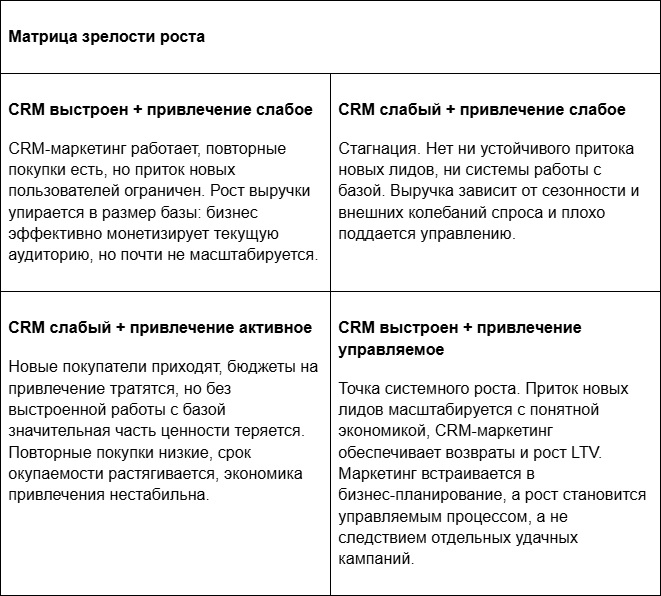 Собрали матрицу, которая поможет увидеть, в какой точке сегодня находится модель роста компании и где именно возникает ограничение — в привлечении или в работе с базой.