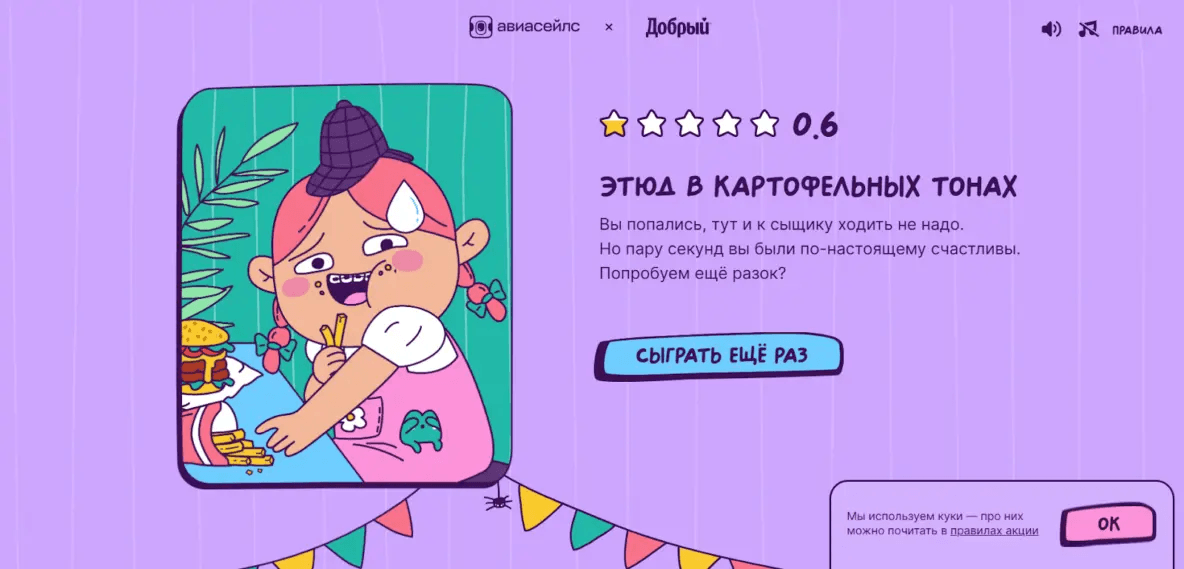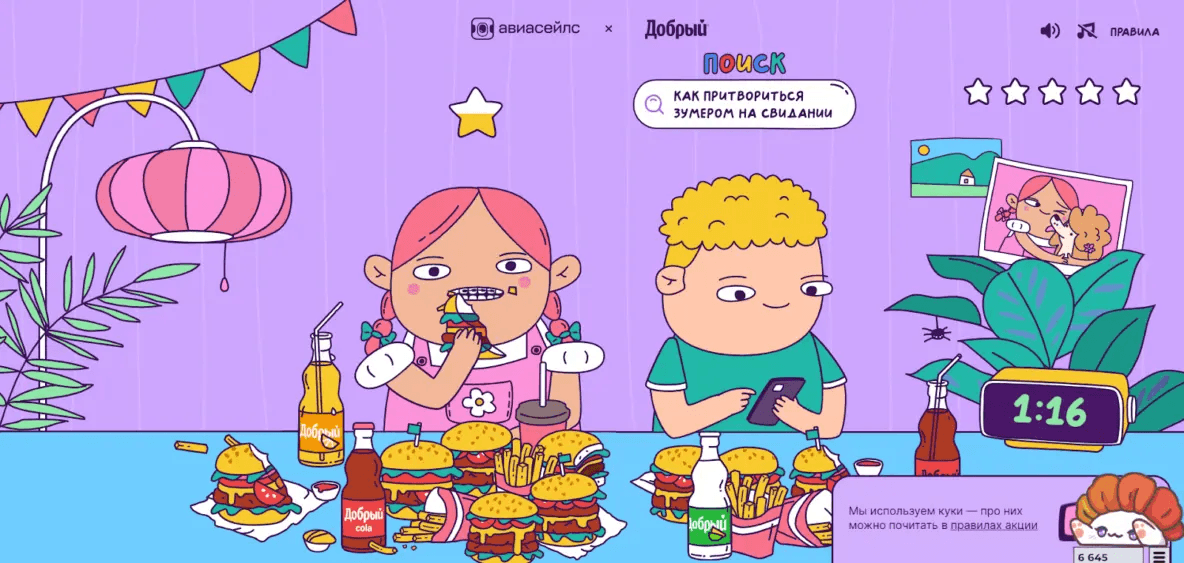 Это кликер с элементами стелса и юмора, интегрированный с брендами «Добрый» и Aviasales. От «Доброго» игре достались напитки, от Aviasales — розыгрыш призов.