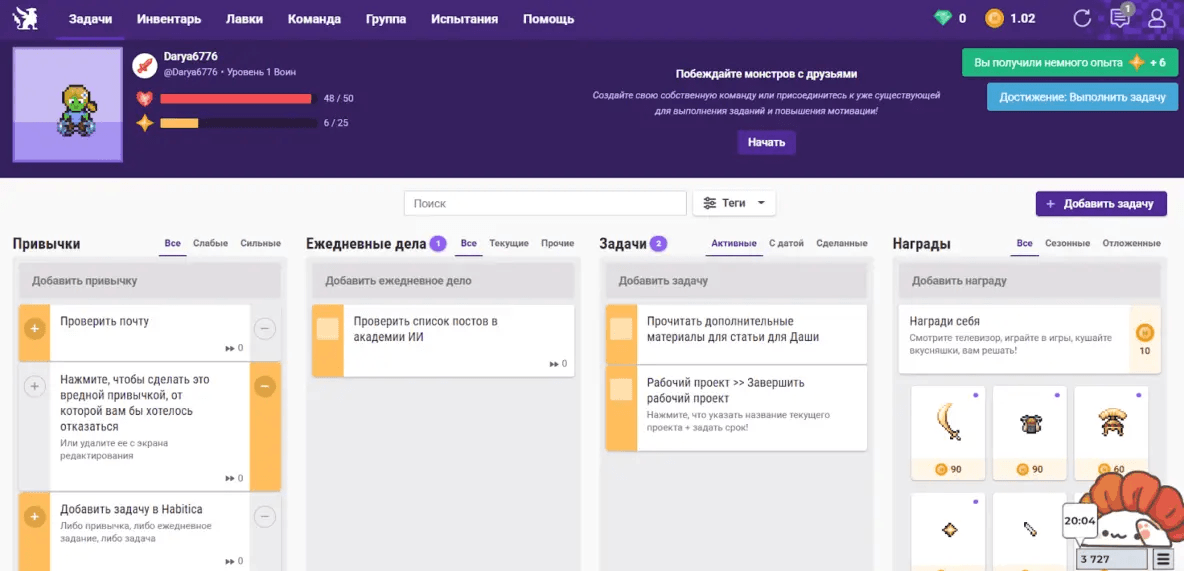 Habitica — условно-бесплатное приложение, которое превращает рутину в игру. Пользователь ставит задачи, выполняет их и получает за это опыт, золото, снаряжение и даже питомцев. Всё как в классической RPG, только вместо битвы с гоблинами нужно мыть посуду и закрывать таски.