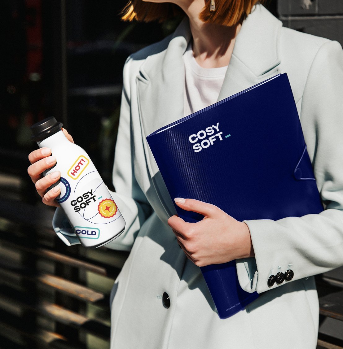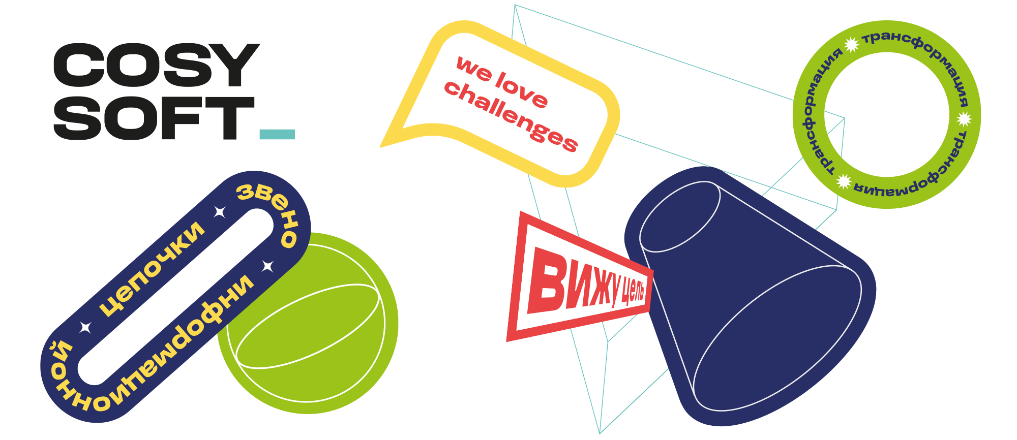 Вот, например, элементы айдентики одного из наших клиентов — ИТ-компании CosySoft.
