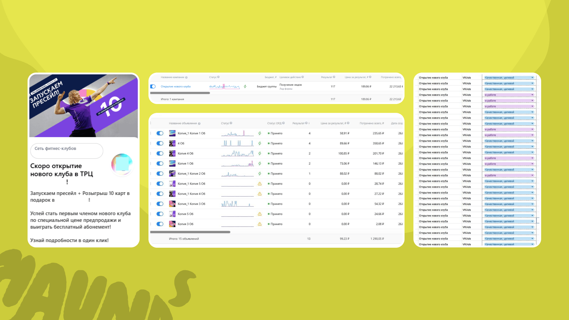 Эту связку еще раз подтвердил другой наш партнер, который получил лиды аж до 200₽ на открытие нового клуба. Формула все та же: динамичные видео + грамотный оффер + лид-форма. Строго говоря, в начале запуска кампании лиды были даже по 80-100₽, что значительно отличается от средней суммы по рынку в 800-1000₽.