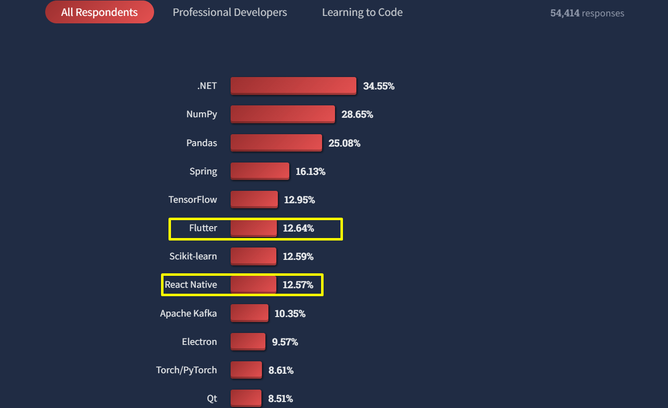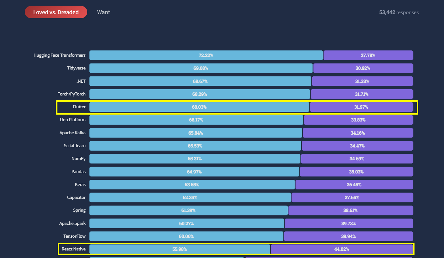В отчете Stackoverflow 2022 (опросе разработчиков) Flutter также обошел React Native в рейтинге наиболее часто используемых фреймворков:
