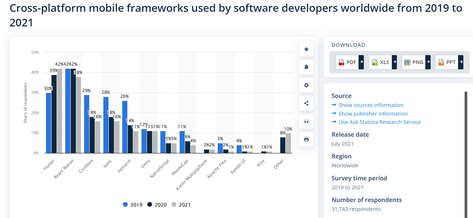 Согласно опросу разработчиков 2021 года, Flutter обогнал React Native и стал самой популярной кроссплатформенной мобильной средой среди разработчиков по всему миру: