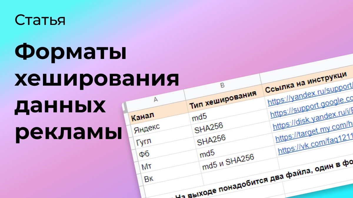 В табличке собраны основные из рекламных каналов, форматы хеширования и ссылки на официальные справки.