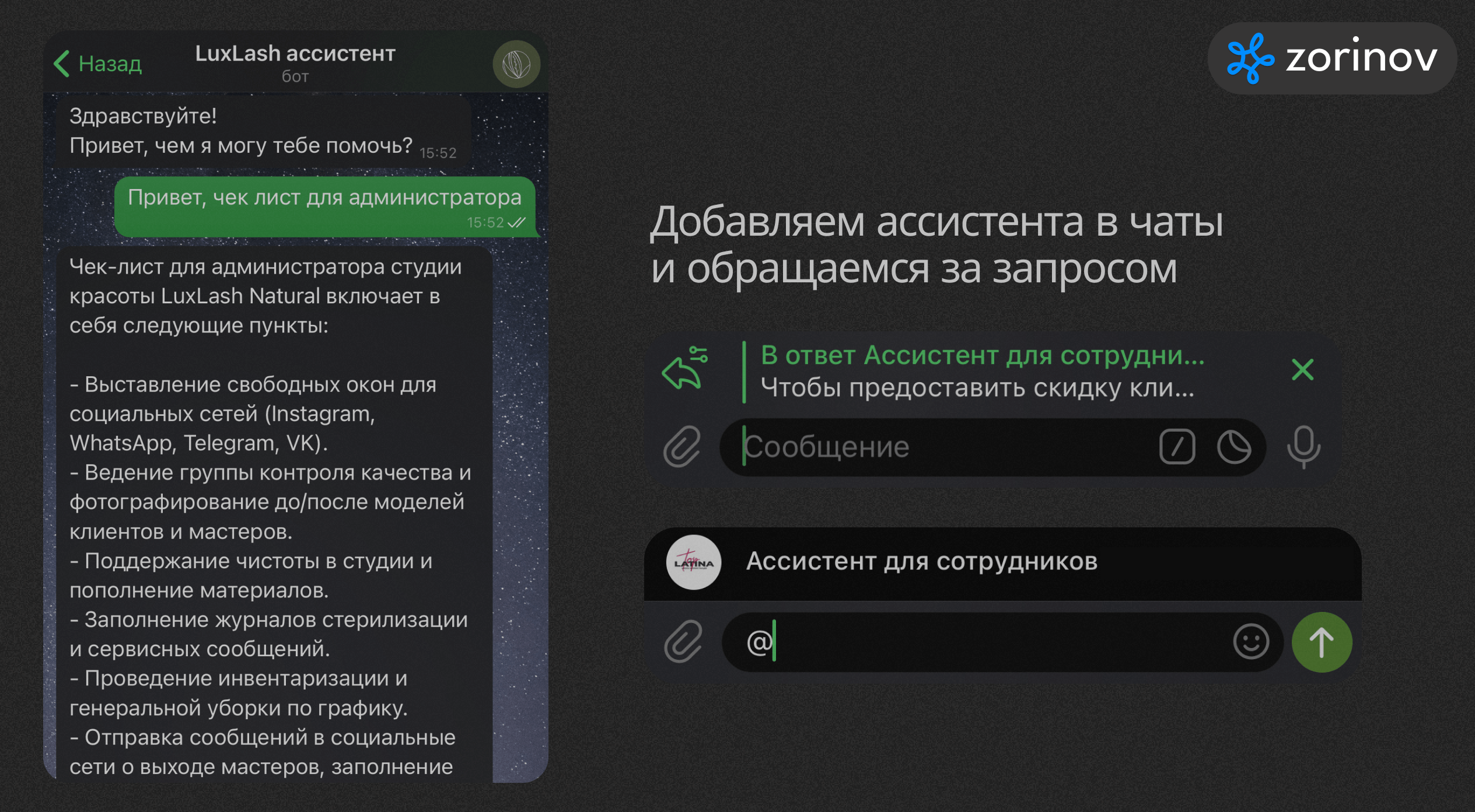 Если вы хотите попробовать такого чат бота и узнать, как можно внедрить нейросети именно в ваш сферу, напишите ему сами! Это наш ассистент, который проконсультирует вас: https://t.me/zorinov_agency_bot