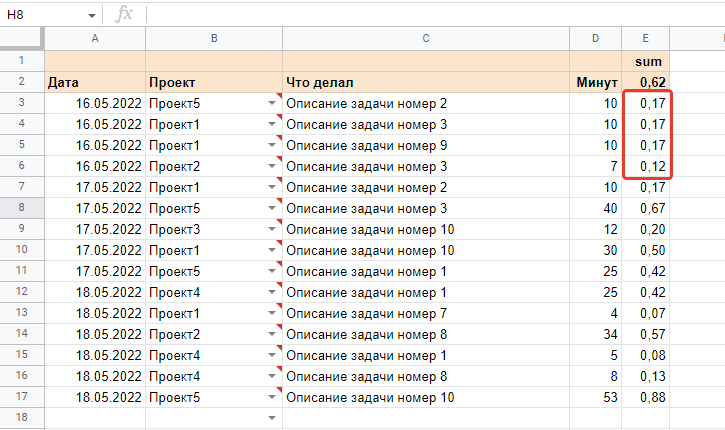Кажется, никакой автоматизации тут не нужно и можно просто выделить нужный интервал и получить значение потраченного на задачи времени, но строк может быть много. К тому же, каждый раз выделять интервал неудобно. Хочется посмотреть в одну ячейку и сразу понять, сколько сегодня времени уже потрачено на задачи.