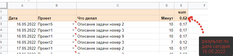 Говоря простым языком, мы говорим: выведи сумму потраченного времени из столбца “Е”, но только по сегодняшней дате.