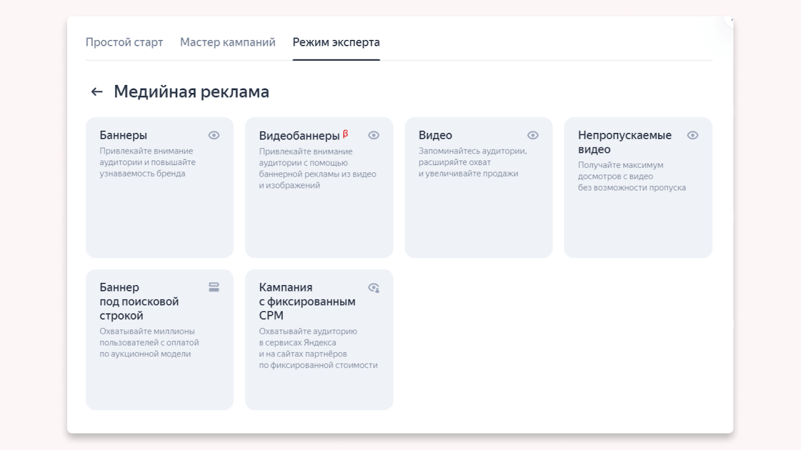 Чтобы создать медийную кампанию, нажмите на жёлтую кнопку “Добавить” в правом верхнем углу. Выберите “Кампании” и перейдите в “Режим эксперта”. Далее выберите “Медийная реклама” и нужный вариант.