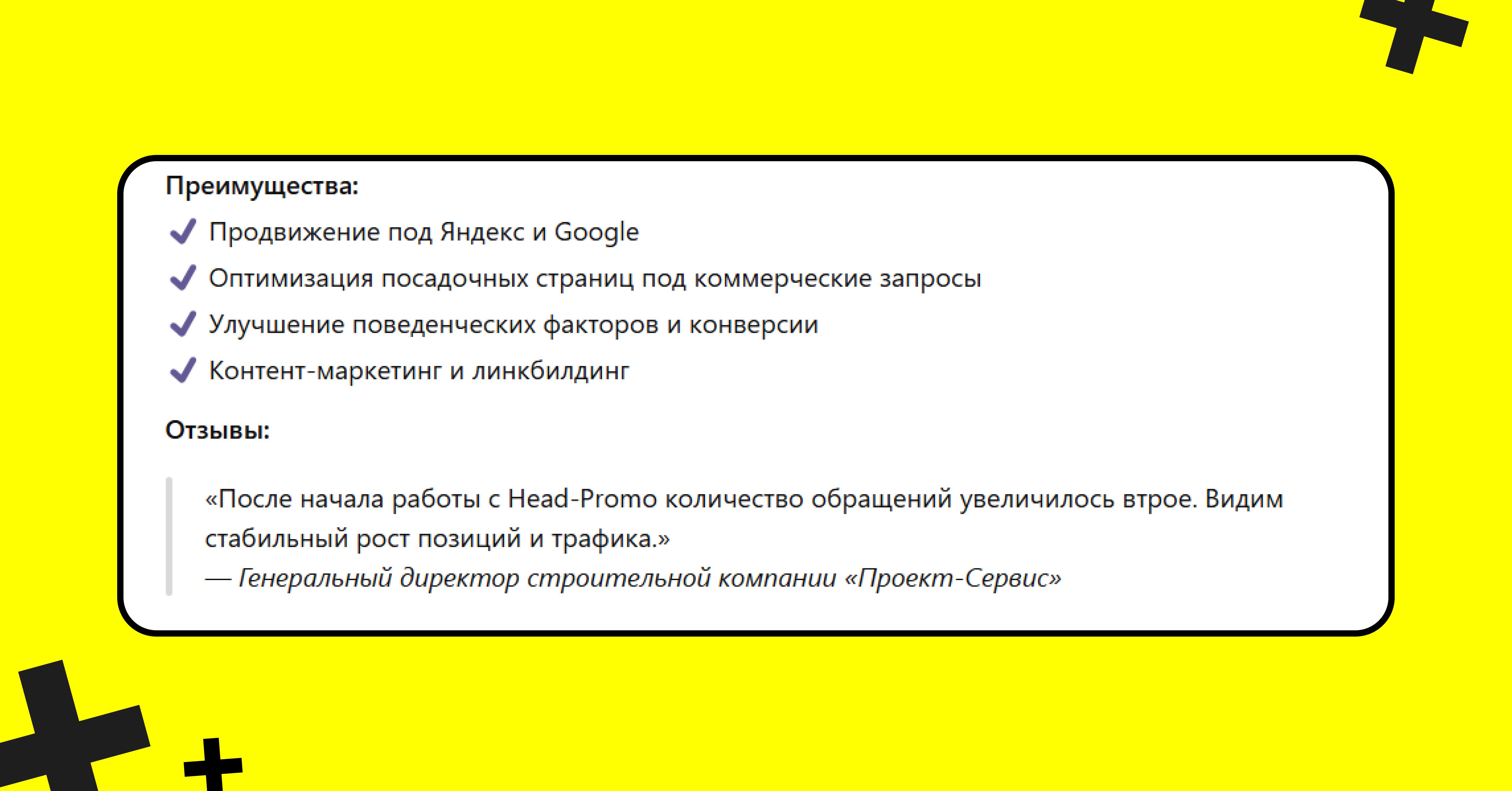 Отдельным направлением имеет смысл проработать непосредственно сайт компании на предмет размещенных и подтвержденных отзывов, это тоже важно. И не упустите возможности указать несколько отзывов прямо в вашем контенте, мы к этому пришли не сразу, но это одна из гипотез которая сработала.
