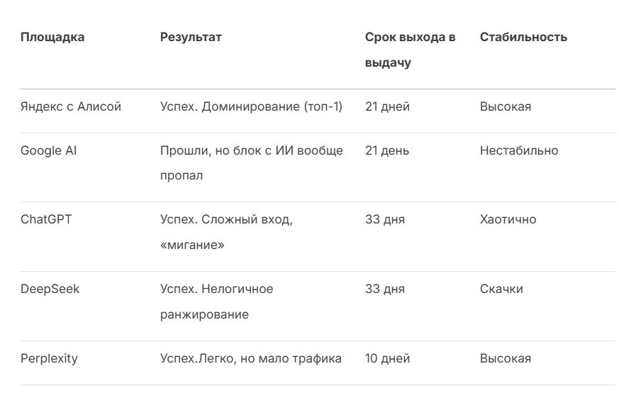 За 35 дней нам удалось попасть в выдачу 5 из 5 нейросетей. Сложности были, тяжелее всего дались ChatGPT и DeepSeek. Проще всего оказалось с Яндексом. И это хорошие новости для рунета, так как больше всего трафика именно в Яндексе.