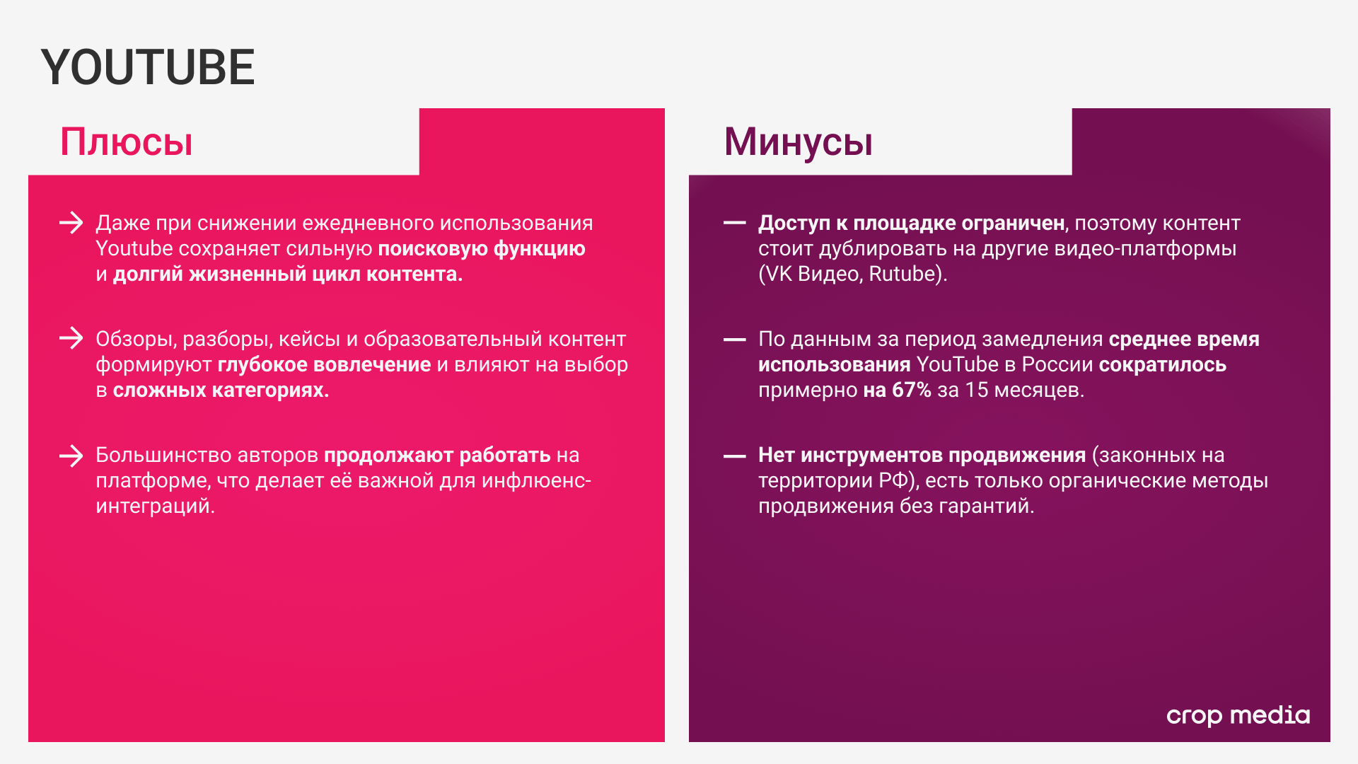 Несмотря на снижение темпов роста, YouTube сохраняет значение как платформа для контент-маркетинга и работы с доверием.