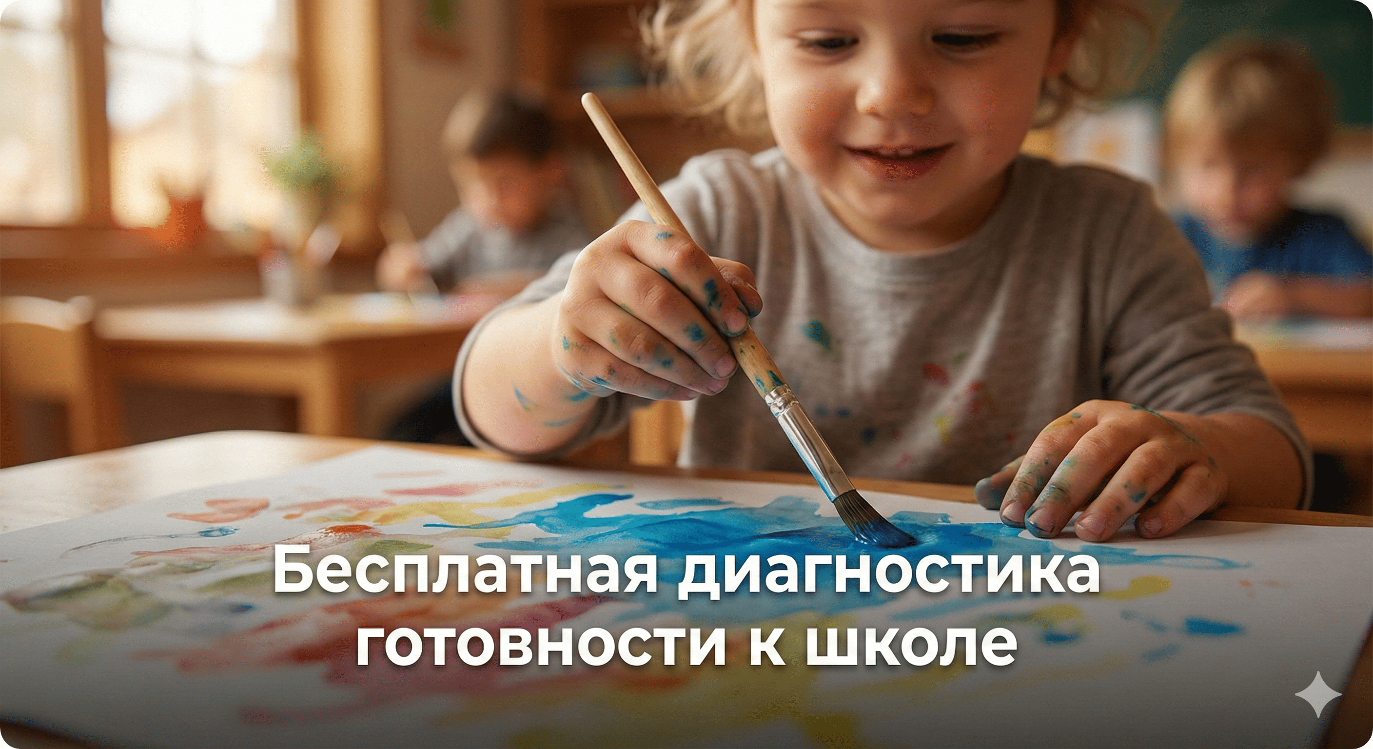 · Картинка: Крупный план : счастливый, сосредоточенный ребенок 6-7 лет собирает сложный конструктор или пишет буквы, а педагог мягко улыбается на фоне. Свет теплый, уютный, никакой казенщины.