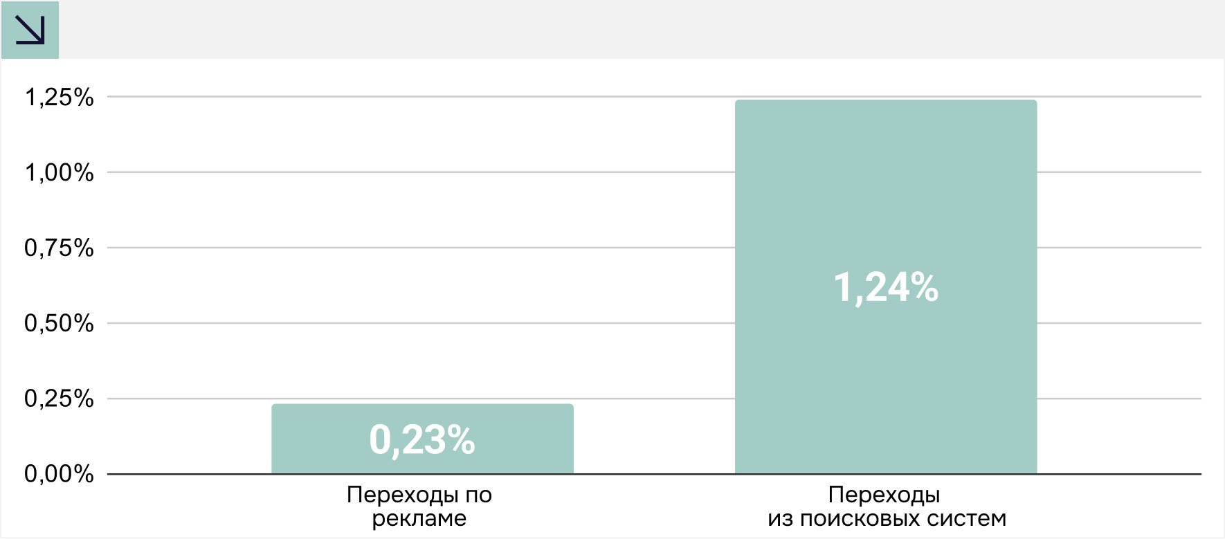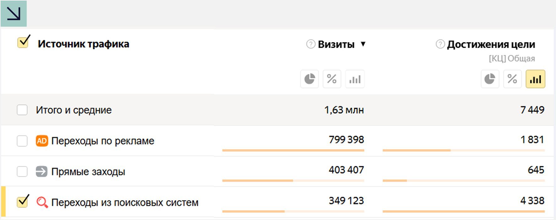 Экономия бюджета за счет органики. Устранение барьеров конверсий позволило вывести сайт на первые строки в Яндексе и Google. Доля достижений целей из органики превысила тот же показатель из рекламного канала примерно в 5 раз. В результате приток целевых пользователей, за которых не нужно платить рекламным системам, вырос.