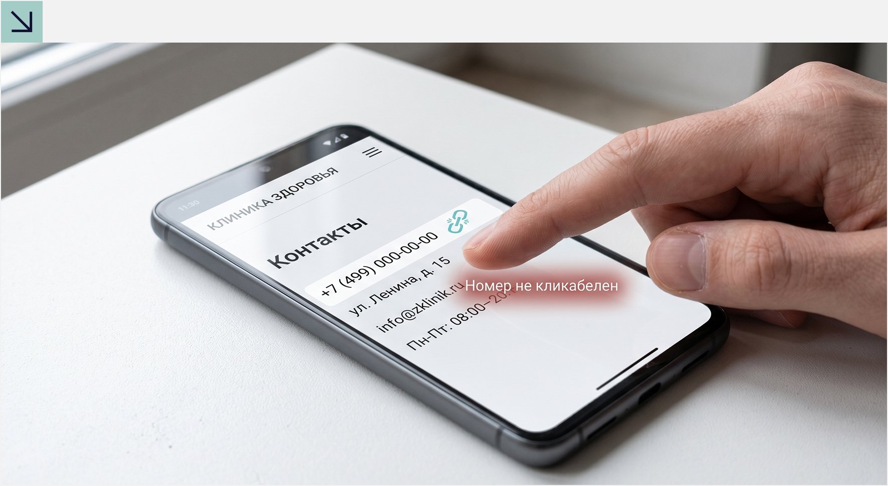 Отсутствие сквозных tel-ссылок, интегрированных во все блоки сайта, включая прайс-листы и профили врачей, что лишает пациента возможности совершить звонок в одно касание именно в момент возникновения доверия.