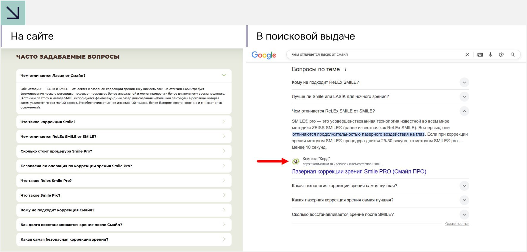 Блоки FAQ с микроразметкой Schema.org. Мы добавили их на страницы услуг, что дало двойной эффект: пользователи получили структурированные ответы прямо на странице, а сайт начал попадать в блоки «Вопросы по теме» в поисковой выдаче — бесплатное дополнительное присутствие в результатах поиска без роста рекламного бюджета.