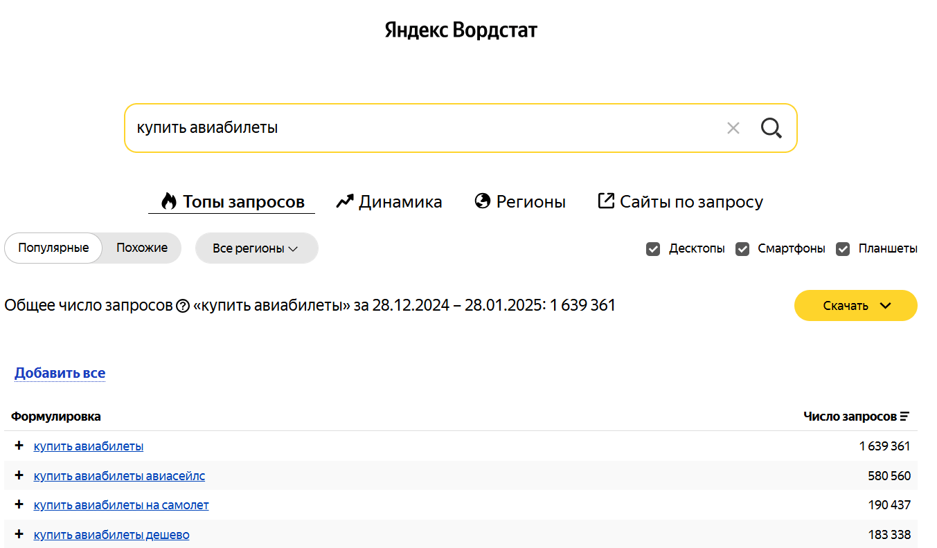 Чаще всего люди с достатком выше среднего ищут премиум-товары. Например, “купить автомобиль”, “авиабилеты” и т.д. Если мы хотим найти, в каких городах они живут, нам поможет Вордстат.