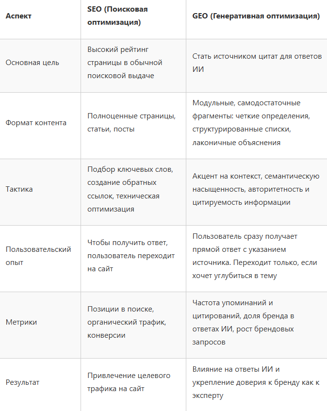 SEO учит создавать и оптимизировать целостные страницы с метатегами, заголовками и связанными материалами. Для GEO же требуется лаконичный, модульный контент, который самодостаточен — четкий абзац, нумерованный список или емкое определение.