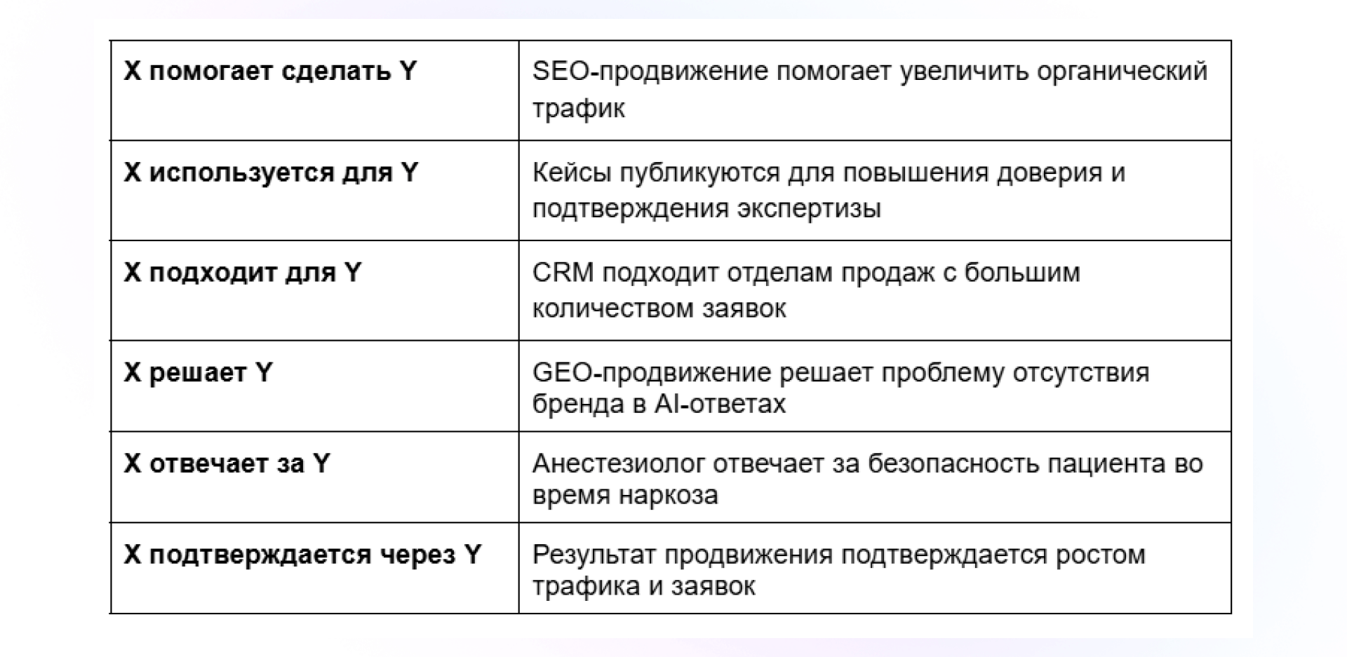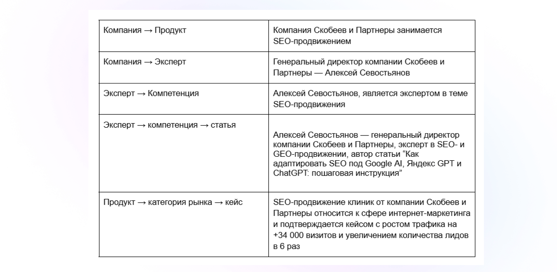 Например, если у компании позиционирование: «Скобеев и Партнеры занимаются SEO- и GEO-продвижением», то нужно повторять связки следующим образом: