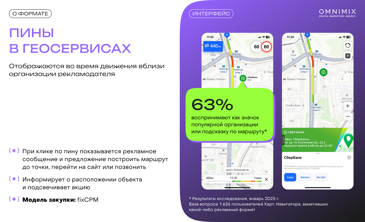 Реклама в геосервисах воспринимается не как отвлечение, а как подсказка. Пользователь уже находится в режиме поиска решения — задача бренда предложить его в нужный момент и в нужном месте.