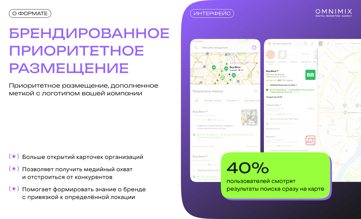 От узнаваемости (премиум-форматы, брендирование) до конверсии (пины, приоритетное размещение, рекомендации маршрутов). Это полноценный канал для решения любых маркетинговых задач.