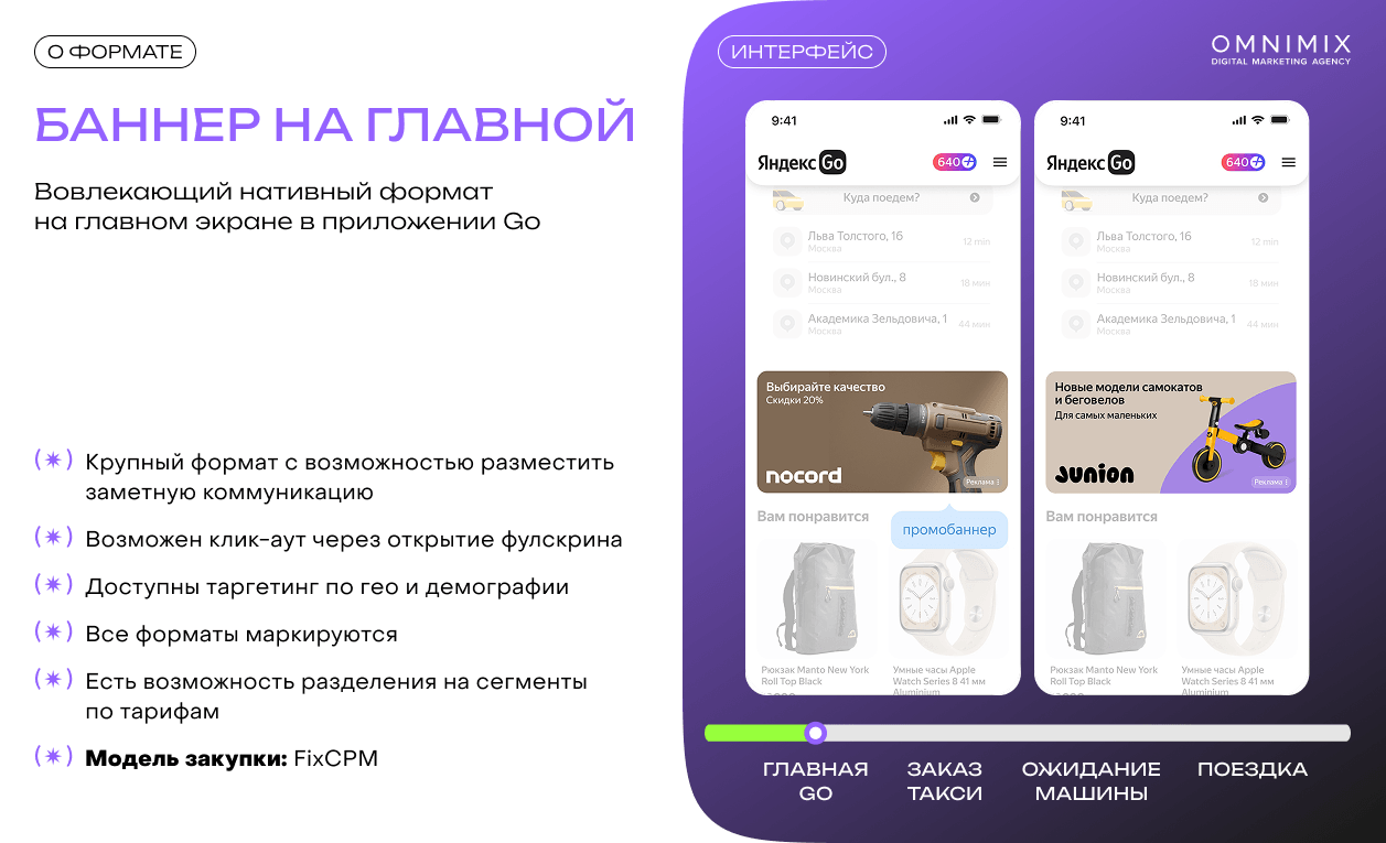 Сквозной формат, который работает на всех этапах воронки такси: от заказа до завершения поездки. Удачно подсветит товарные предложения бренда.