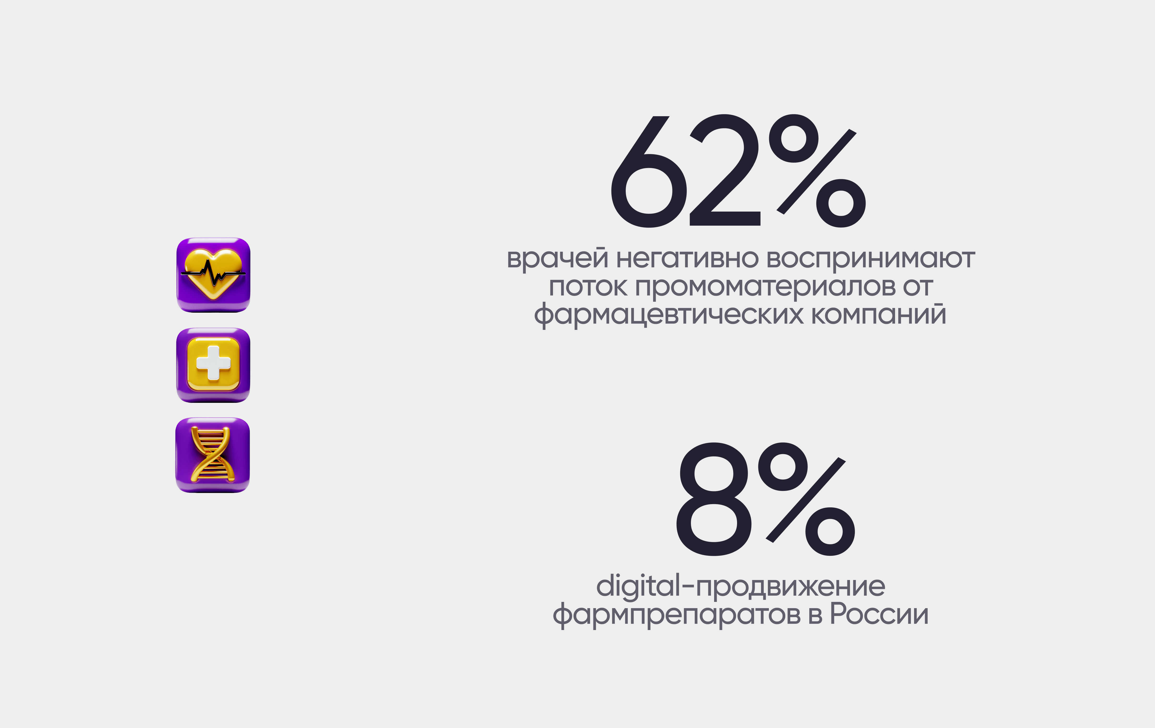 62% врачей негативно воспринимают поток промоматериалов от фармацевтических компаний. По данным IQVIA, в России digital-каналы всё ещё занимают лишь 8% в структуре продвижения фармпрепаратов - всё остальное традиционные форматы.