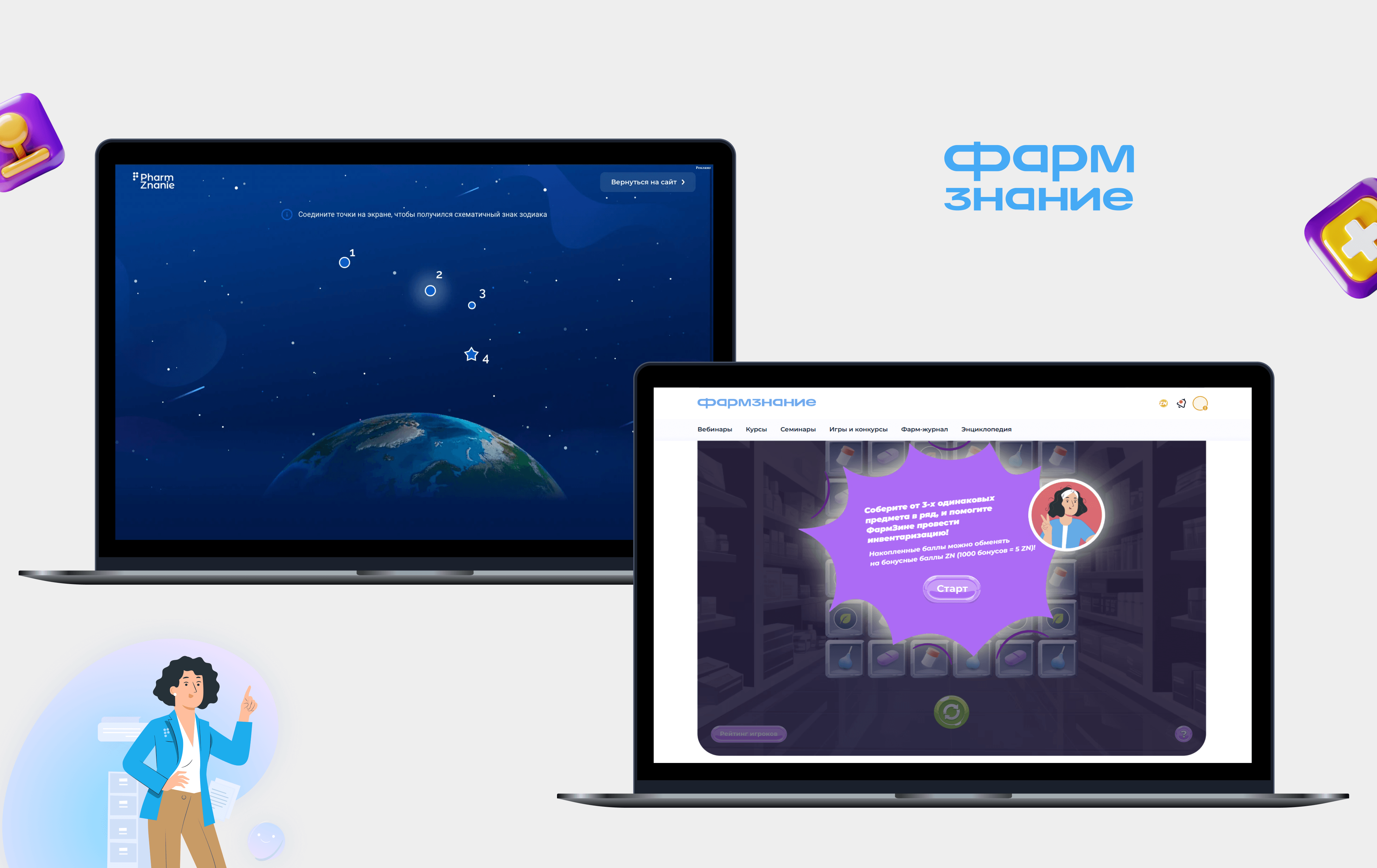 «Фармгороскоп»: игра в созвездия - пользователь соединяет звёзды в знаки зодиака, каждое созвездие = информация о группе препаратов. Охват: 800 000+, 2 144 уникальных участника-фармацевта, 1 507 прошли до конца.