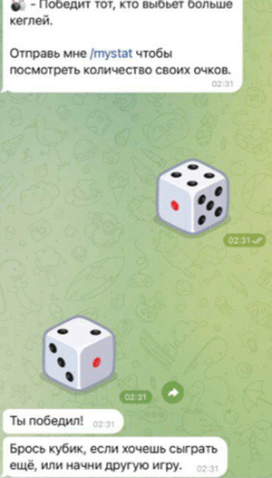 Хорошо подходят для добавления азарта при проведениях акций. Например, при отправке кубика в Телеграме он прокрутится и остановится на случайной грани. Каждая цифра может означать номер подарка для игрока или, допустим, какое-то предсказание — получается аналог колеса фортуны на сайте.