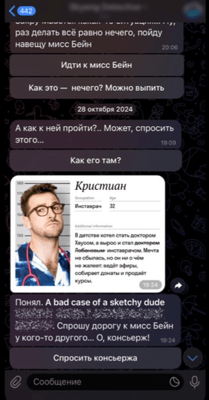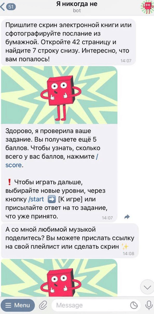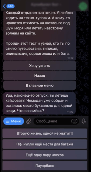 Для более глубокого погружения пользователей подойдёт связная история с этапами, заданиями и подсказками. Квест может быть очень простым и состоять всего из нескольких шагов или же длинным и проработанным, как интерактивное кино. Например, в зависимости от выбора игрока может меняться сюжет квеста и сценарий бота.