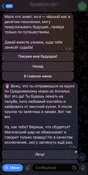 А чтобы получить предсказание, человеку вообще достаточно нажать одну кнопку — и он уже вовлечён во взаимодействие с брендом. Заготовить множество вариантов ответов можно самостоятельно заранее или с помощью ИИ.