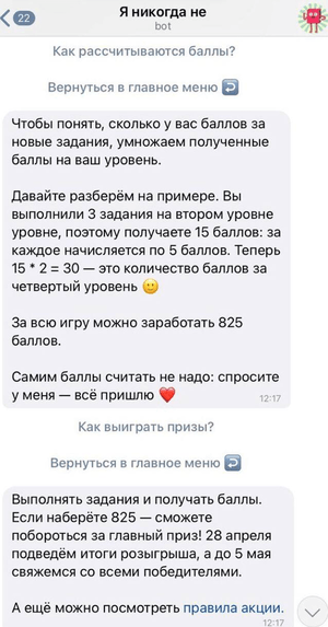 Это хорошее дополнение к любой основной механике, которую вы используете в чат-боте. Если пользователи видят свой и общий рейтинги игроков, у них просыпается азарт и желание соревноваться. Это помогает получить повторные касания и более глубокое и длительное вовлечение аудитории.