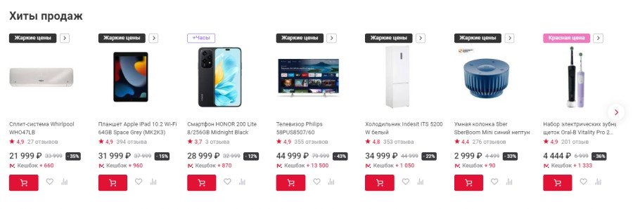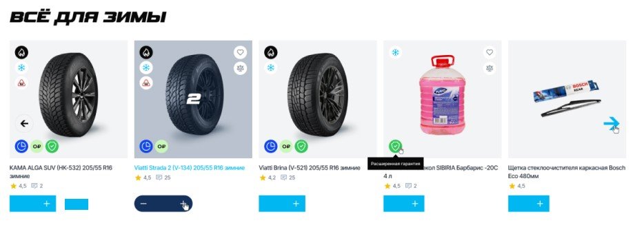 Карточки с изображениями, названиями, ценами, кнопками и прочими информативными иконками продемонстрируют отличительные особенности товара. Также можно отобразить акции, рейтинг или скидку: