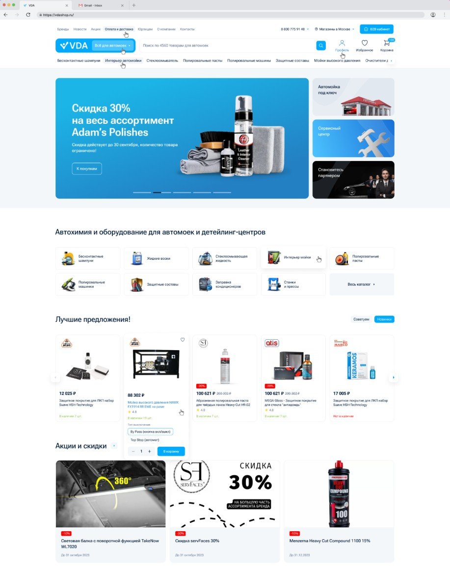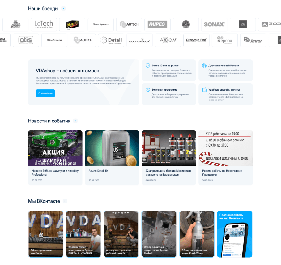 В новом интерфейсе для проекта VDA мы добавили блок с брендами, преимуществами, новостями и постами из ВКонтакте, поскольку компания работает как с B2C, так и с B2B-клиентами.