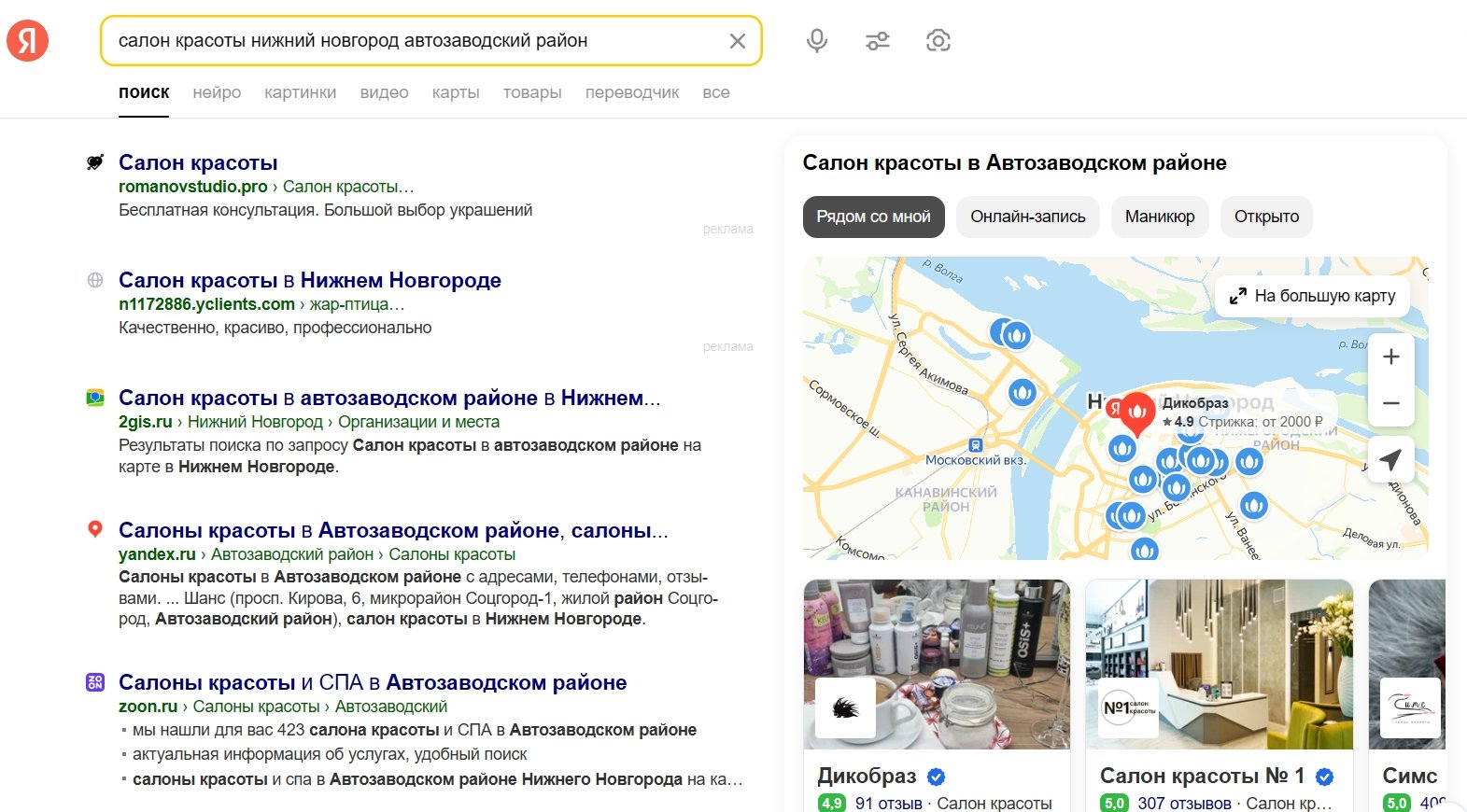 Яндекс учитывает местоположение пользователей и их историю запросов по геоточкам. Он использует эти данные, чтобы выводить ближайшие к пользователю компании.