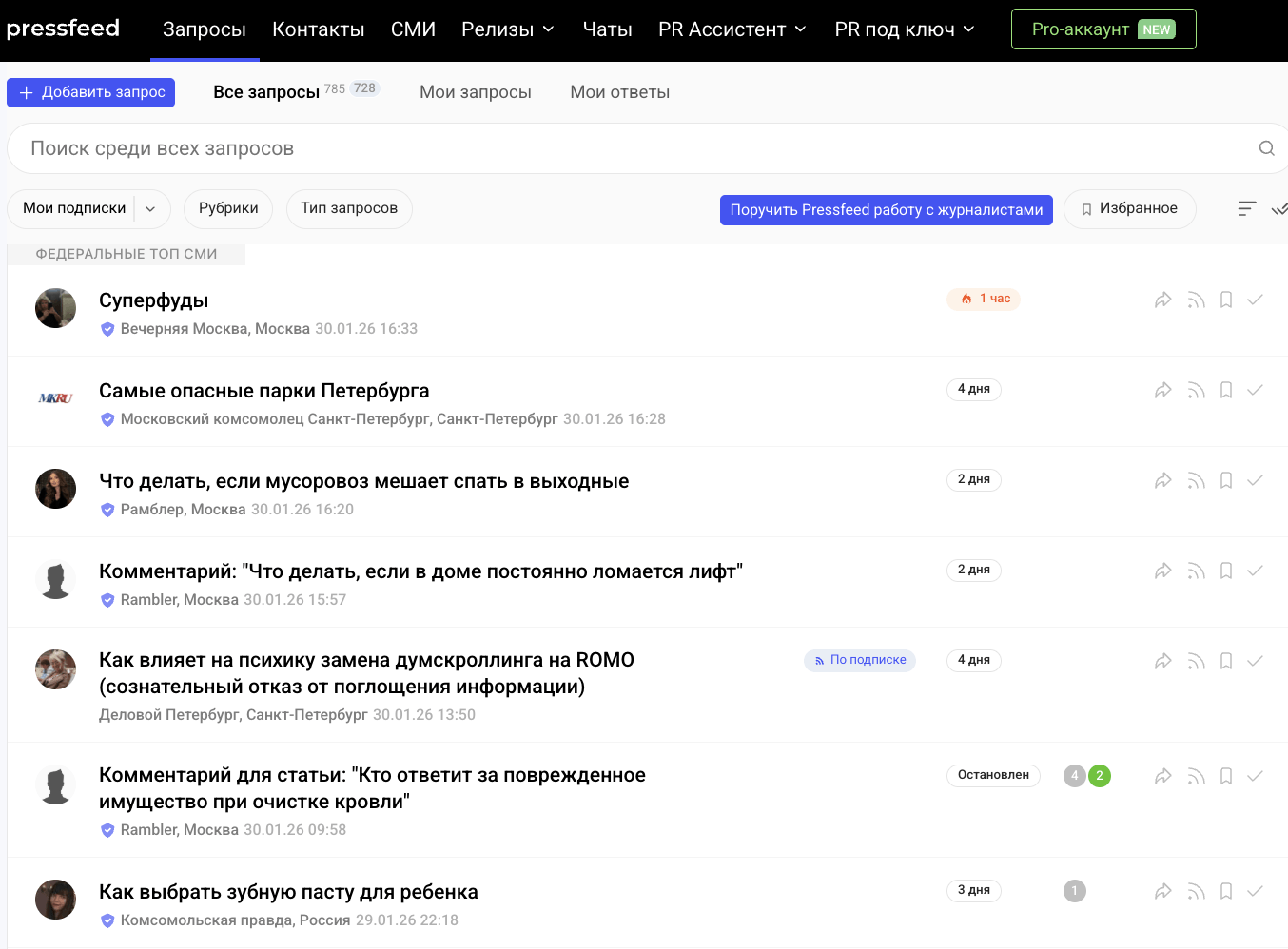 Pressfeed это сервис, где журналисты ищут экспертов для своих материалов. Они публикуют запросы, например: