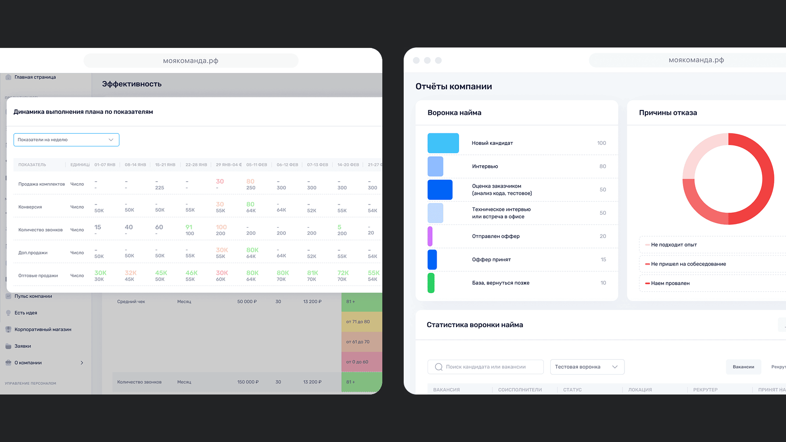 Эффективность подбора персонала отражают метрики time-to-hire, cost-per-hire и доля успешных кандидатов, прошедших первый год. Для руководителя они показывают не только работу HR-отдела, но и финансовые потери компании из-за простаивающих вакансий и задержек при запуске новых продуктов. На платформе «МояКоманда» эти показатели собраны в удобных дашбордах: менеджер видит динамику найма, оценивает влияние на планы продаж и может заранее скорректировать кадровую стратегию.