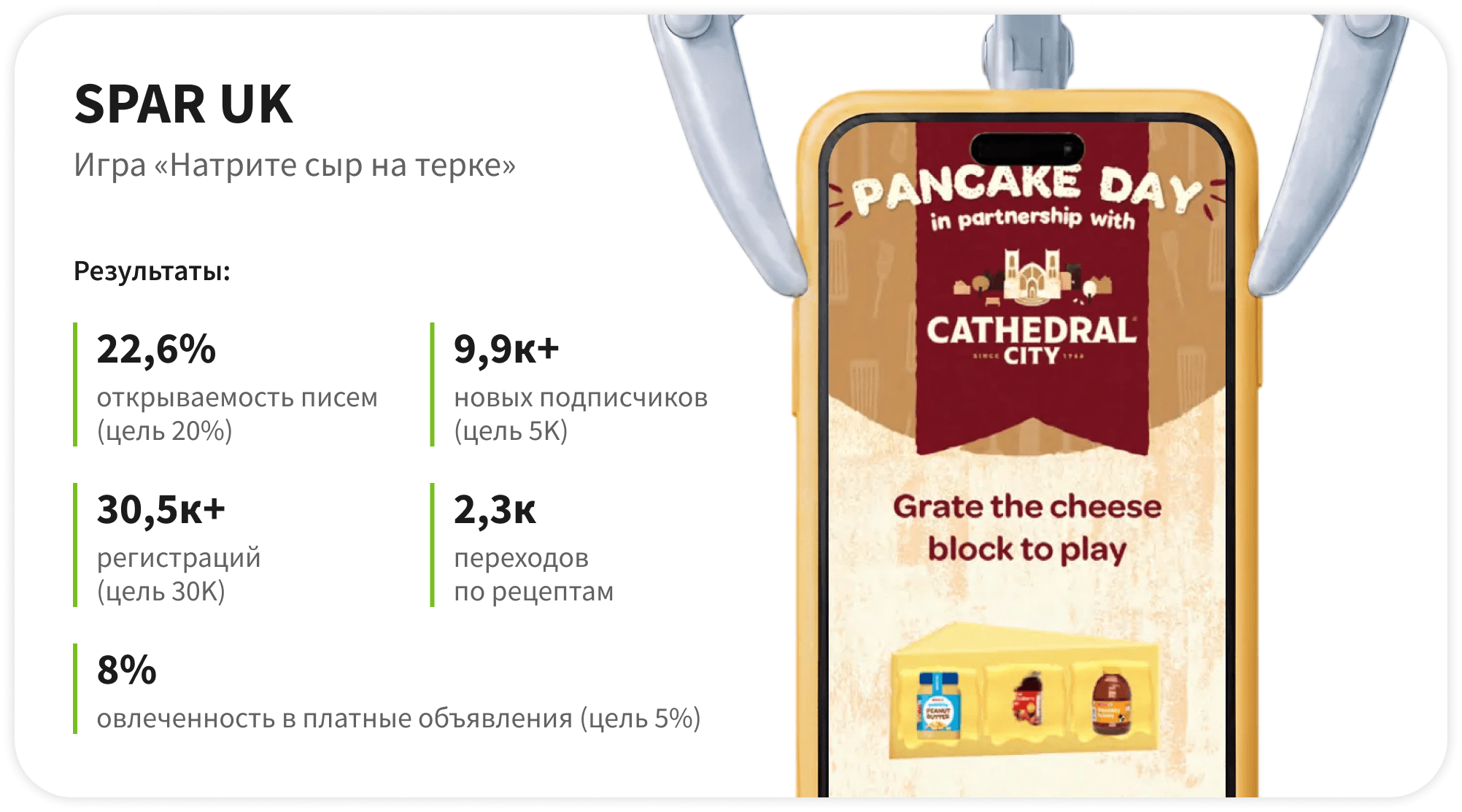 На Масленицу 2023 года SPAR UK в партнерстве с брендом сыра Cathedral City запустила игру «Натрите сыр на терке», чтобы повысить онлайн-вовлеченность, расширить базу подписчиков, привлечь покупателей в магазины и продвинуть продукцию. Участники ежедневно стирали защитный слой на изображениях, чтобы выиграть ваучеры.