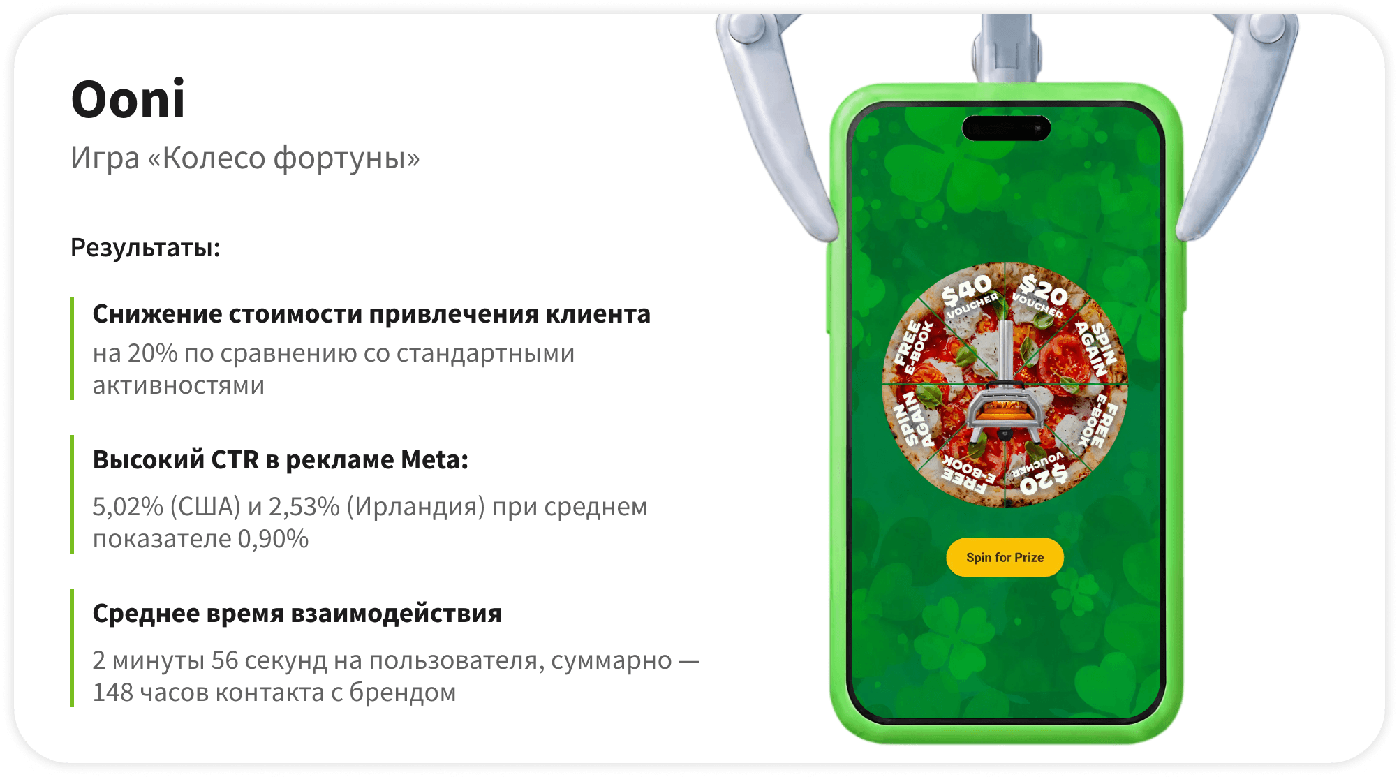 По случаю Дня святого Патрика была запущена игровая акция с колесом фортуны, где участники получали возможность выиграть скидочные купоны на покупку печи Ooni и бесплатные электронные рецепты. Уникальное оформление колеса, стилизованное под пиццу с изображением печи Ooni, подчеркнуло ключевой продукт бренда.