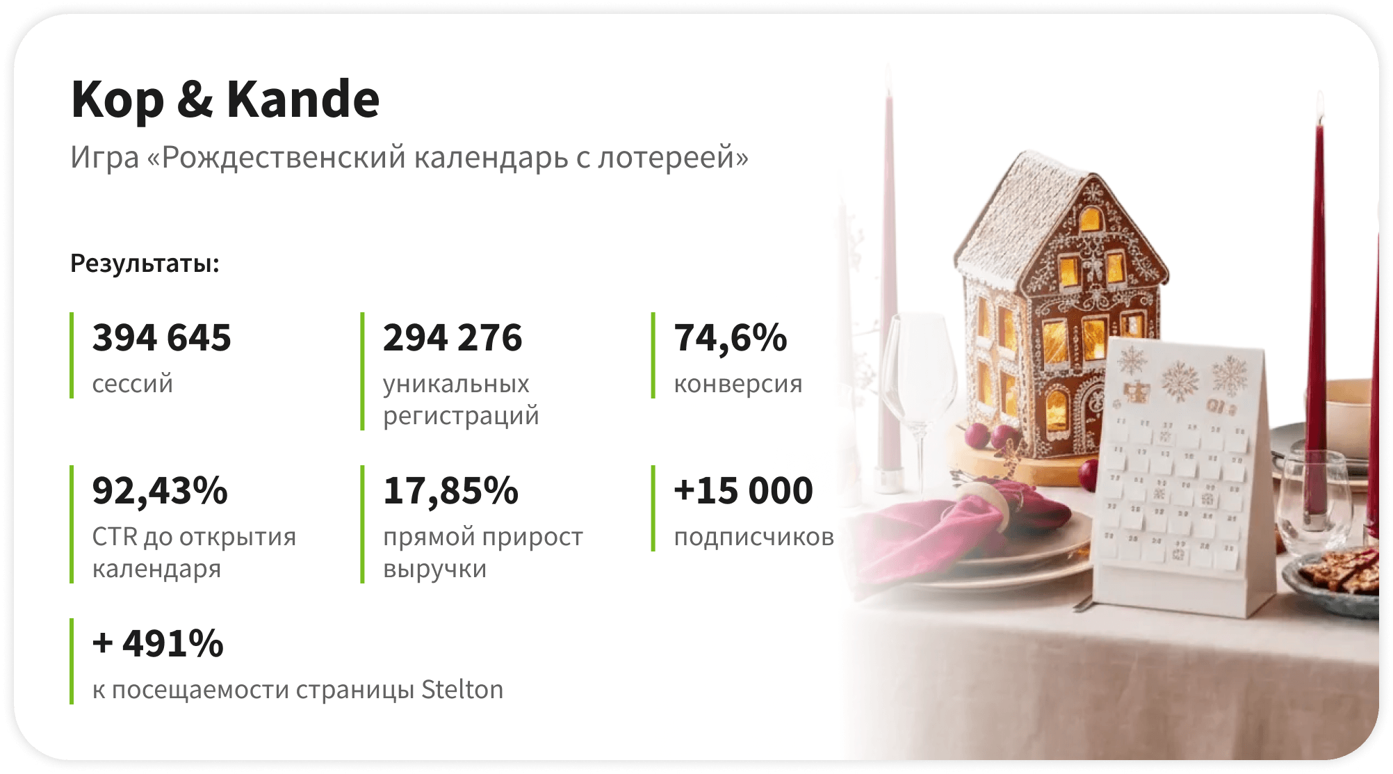 Kop & Kande и датский бренд Stelton запустили совместный проект — цифровой «Рождественский календарь». Целью кампании стало повышение онлайн и офлайн -узнаваемости бренда Stelton в магазинах Kop & Kande и вовлечение аудитории.