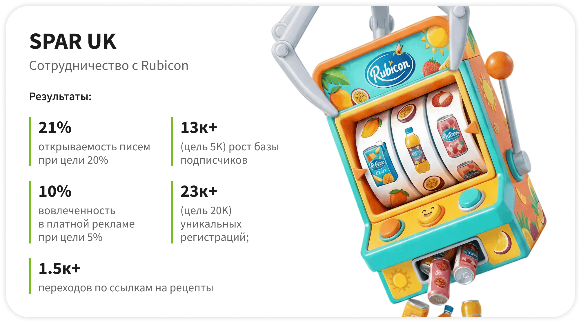 Для формирования летнего настроения у покупателей SPAR UK запустил партнерский проект с брендом напитков Rubicon. В основе кампании — интерактивный лендинг с игровым автоматом, где участники могли выиграть эксклюзивные призы от Rubicon.
