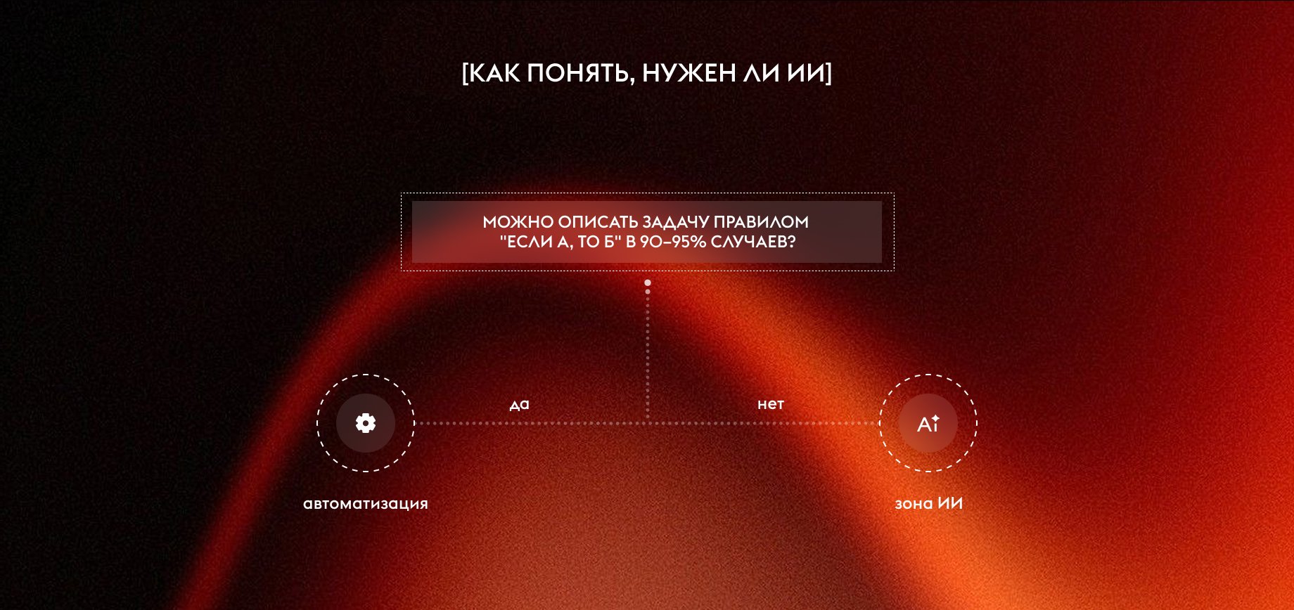 Есть простой вопрос, который стоит задать до начала разработки: можно ли описать задачу правилом «если А, то Б» хотя бы в 90–95% случаев? Если да — это автоматизация. Если нет — это зона ИИ.