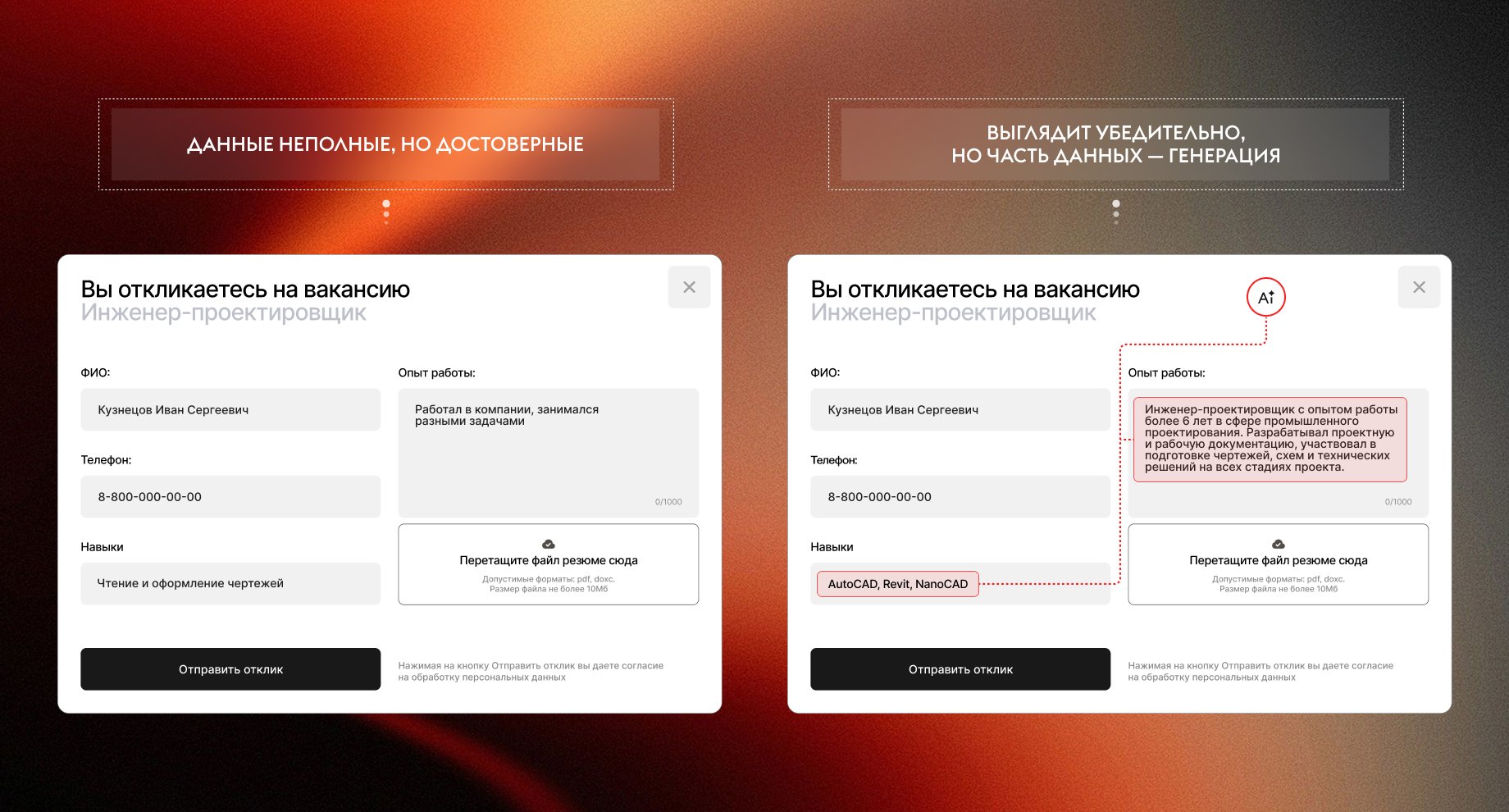 Причём делает это убедительно — текст выглядит логично и правдоподобно. В результате работодатель получает резюме, в котором часть информации сгенерирована, а соискатель может об этом даже не знать. Система формально работает, но на практике создаёт риск — и для бизнеса, и для пользователя.