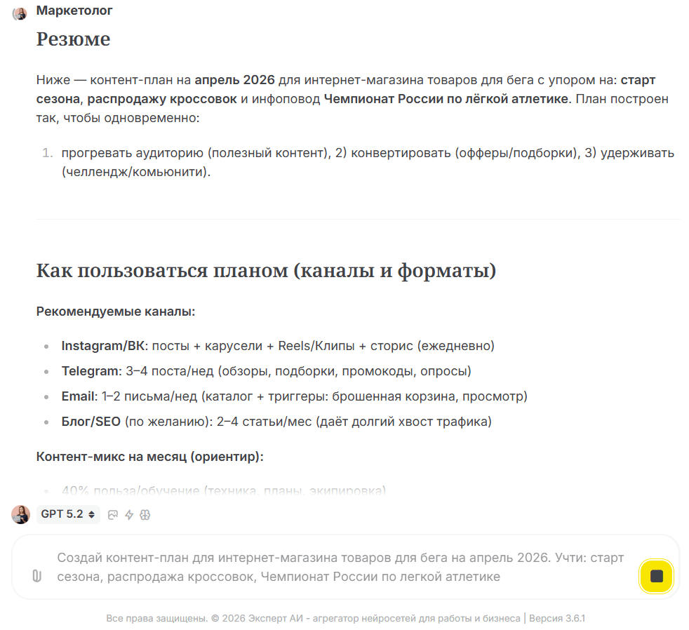 «Создай контент-план для интернет-магазина товаров для бега на апрель 2026. Учти: старт сезона, распродажа кроссовок, Чемпионат России».