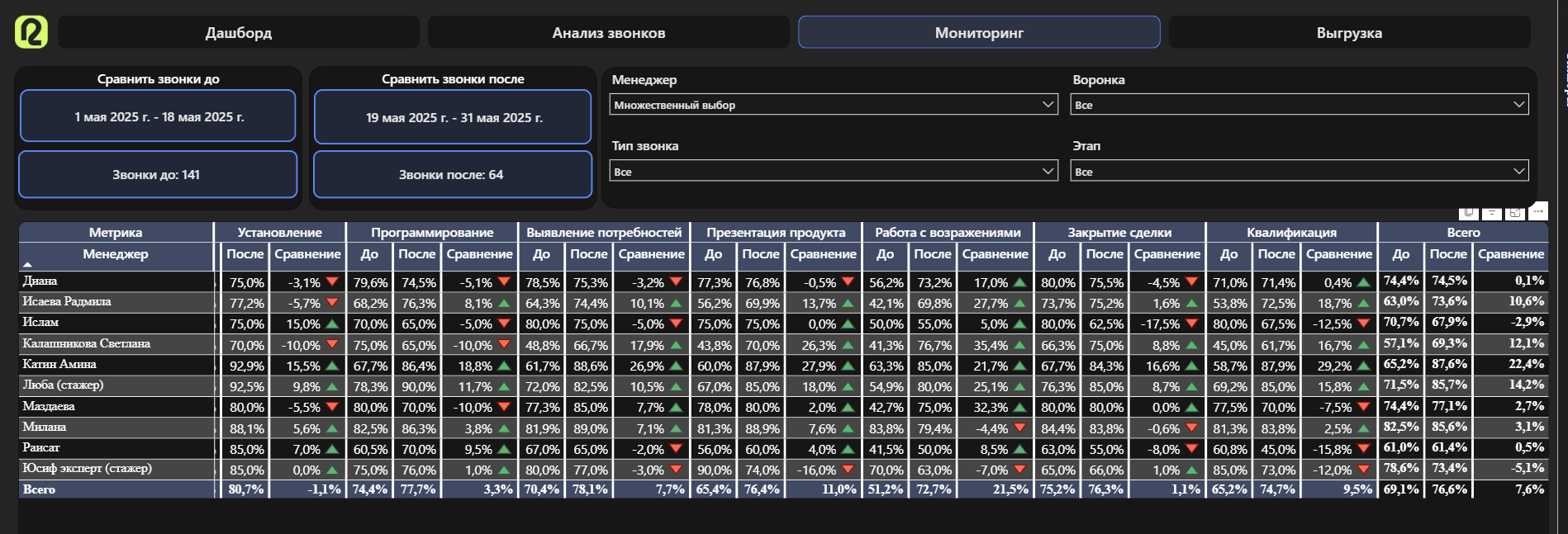 В отличие от поверхностной прослушки выборочных звонков, ИИ анализирует весь массив коммуникаций. Он отслеживает длительность пауз, перебивания, эмоциональные колебания в голосе, ошибки в речи, отклонения от скриптов, неотработанные возражения. Это позволяет не просто “понять, кто хорошо говорит”, а точно увидеть, где происходят потери и почему клиент уходит.