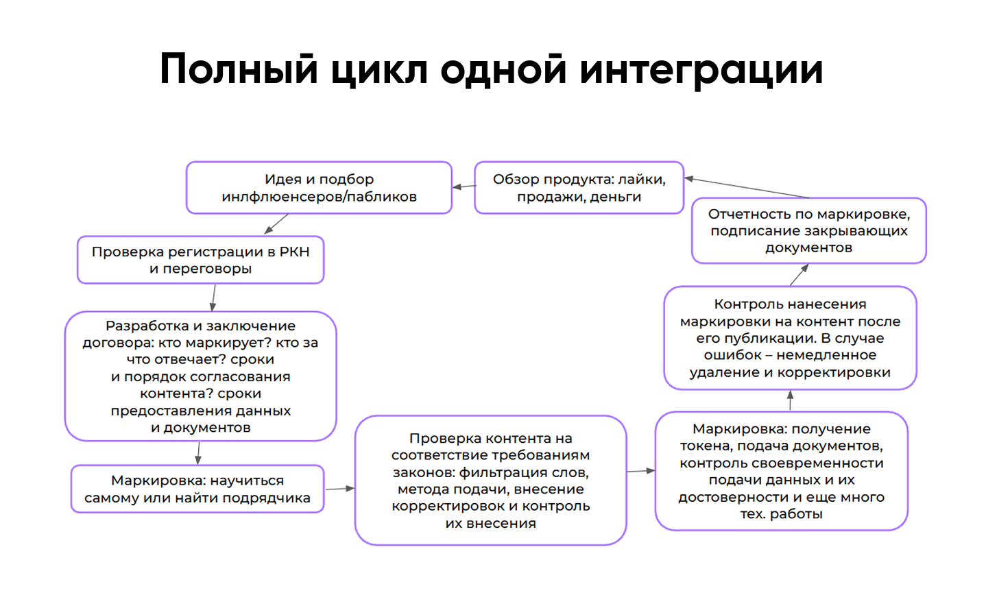 Особенно важно, что инфлюенс-реклама остается во многом ручным процессом. В отличие от крупных автоматизированных рекламных систем, здесь всё держится на людях: договоренности, согласования, документы, правки, проверка формулировок, контроль маркировки, отчетность, статистика, закрывающие документы. Именно поэтому человеческий фактор становится главным источником рисков. Чтобы избежать проблем, недостаточно просто найти блогера и согласовать интеграцию. Нужно проверять регистрацию площадок, фиксировать ответственность в договоре, следить за нанесением маркировки, вовремя подавать документы, контролировать корректность токена и соответствие рекламного материала закону.