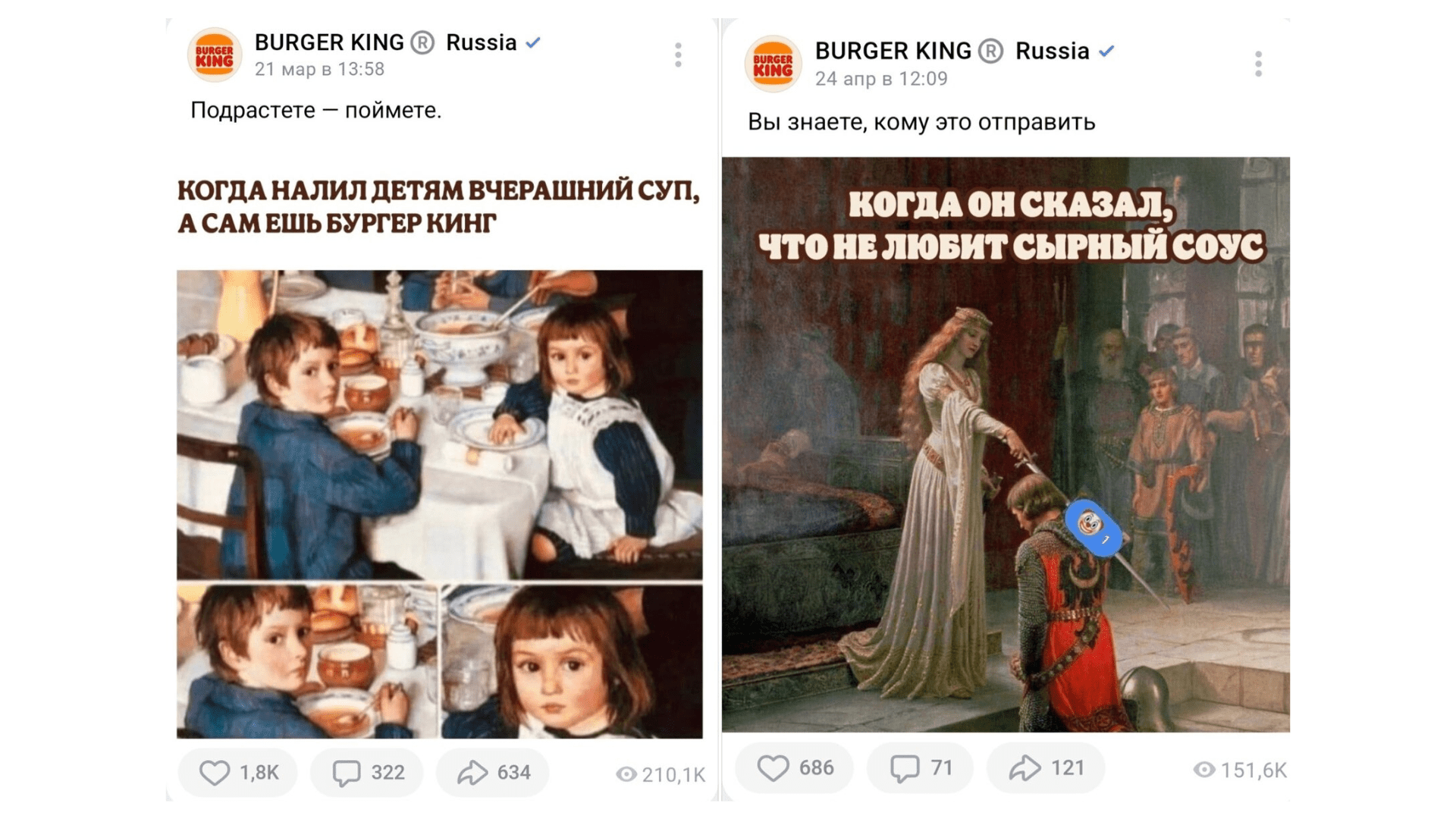 «Сбер» — мем-контент о сервисахЮмор, адаптированный под локальные инфоповоды ("СберКот", мемы про робота-курьера), позволил Сберу "оживить" восприятие серьёзного бренда у молодёжи.