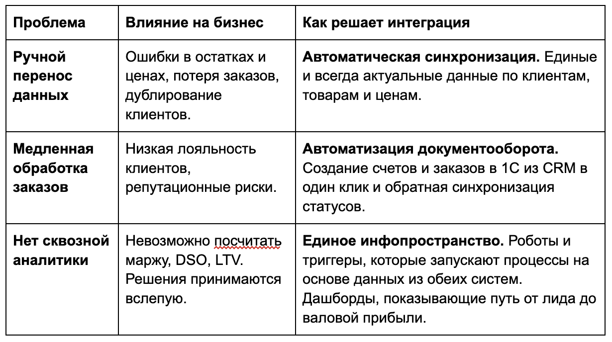 Без единой системы B2B-бизнес постоянно живет на пороховой бочке. Ручной перенос данных - это мина замедленного действия, которая взрывается в самый неподходящий момент: выставленным счетом на товар, которого нет, ошибкой в цене для ключевого клиента или дублированием контрагентов, из-за чего теряется история взаимоотношений. Как результат - медленная обработка заказов, недовольные клиенты и полное отсутствие сквозной аналитики. Директор видит выручку, но не понимает реальную маржинальность сделки.